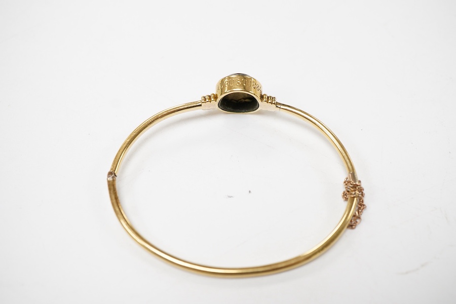 A regimental 'Essex Crystal' bangle, circa 1884, of hinged construction, collet-set with a reverse-carved and painted intaglio depicting the burgee of the Royal Yacht Squadron, mounted in gold, inscribed 'ER August 1884', inner circumference approximately 16.2cm, gross weight approximately 8 grams