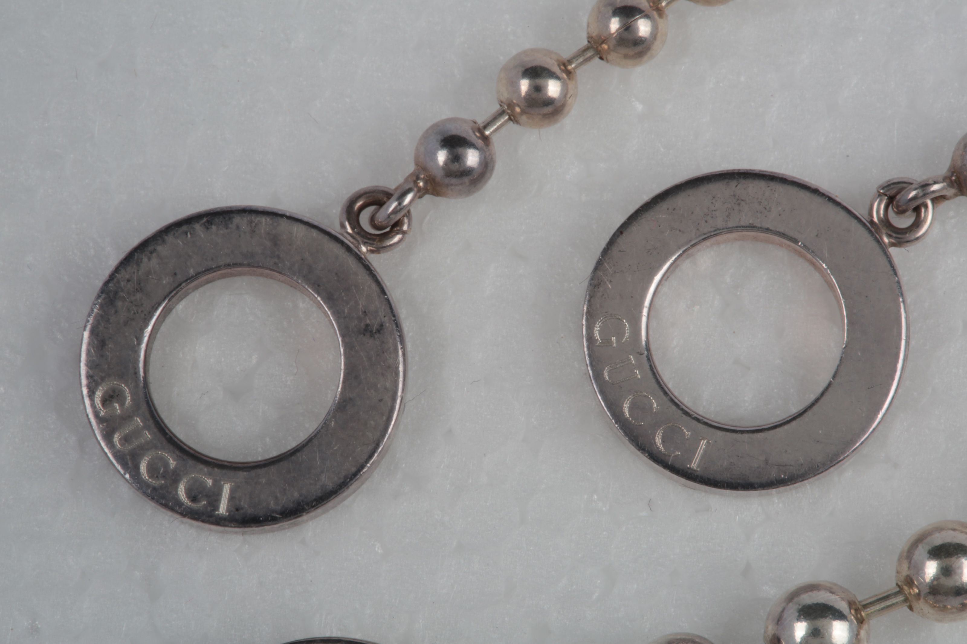 A Gucci silver parure and a pair of Chanel earrings, comprising: a necklace, bracelet and pair of pendant earrings, all of silver bead linking, the bracelet and necklace with toggle clasps, necklace length 41cm, bracelet 19cm, earrings 5.8cm, each signed Gucci, each with Italian maker's marks, combined gross weight approximately 53 grams, box and pouch stamped Gucci; together with a circular pair of resin Chanel double-C monogram ear studs, circa 2013, 1.4cm diameter, post fittings, each signed Chanel, box and pouch stamped Chanel