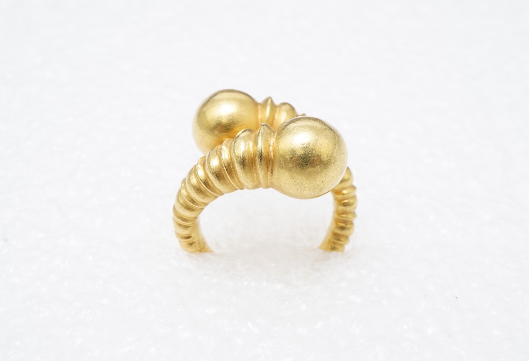 Ilias Lalaounis, a gold ring, the crossover ring of archaeological inspiration, of banded design, each end terminating in a sphere, mounted in gold, size L, maker's mark for Lalaounis, stamped K22, gross weight approximately 10 grams