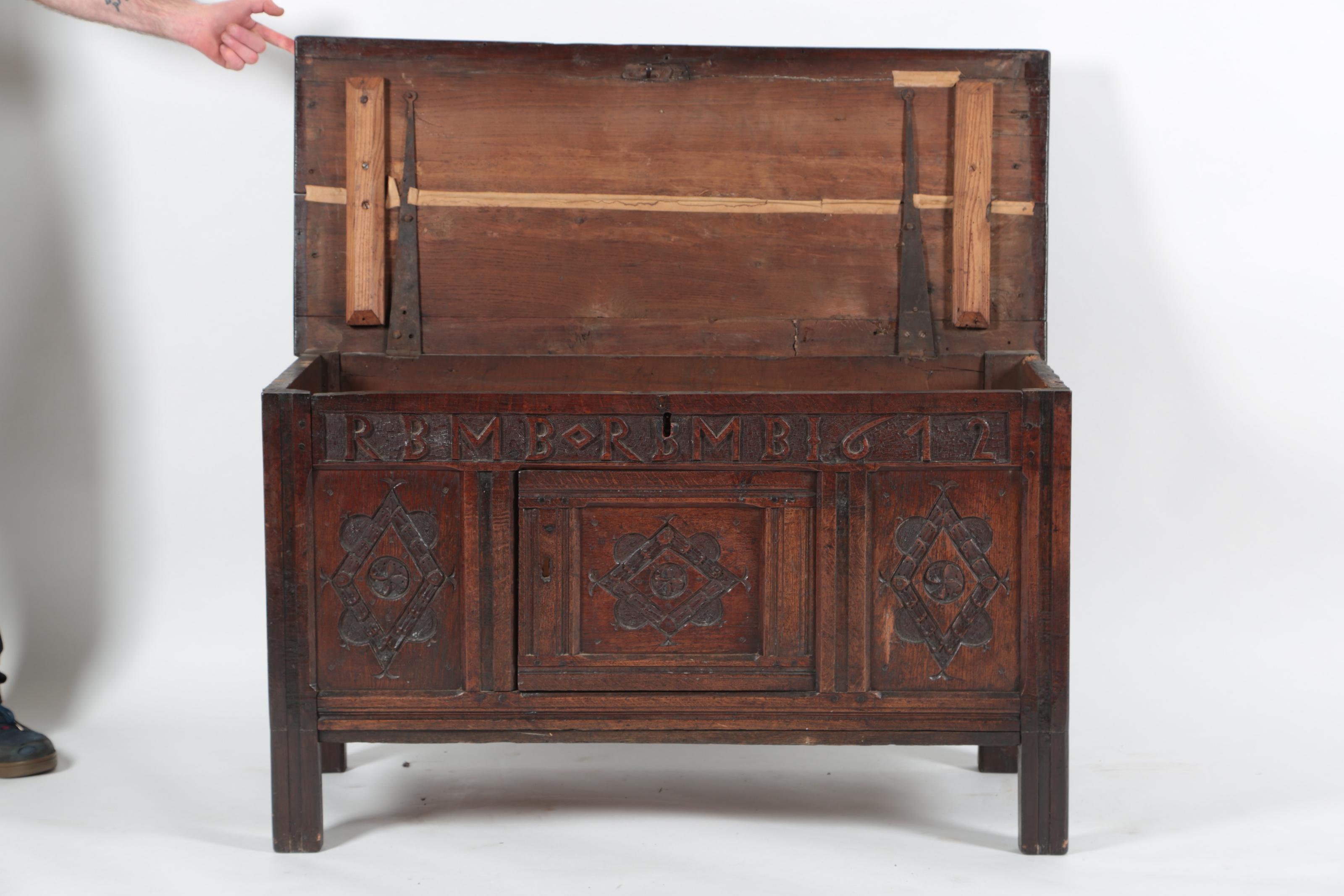 A Charles II oak coffer, dated 1672, the plank top above a frieze carved in relief RBMB . RBMB 1672, above three panels carved with lozenges, the central panel once hinged, now fixed, on replacement stile feet to the front, 117.5cm wide, 50cm deep, 68cm high