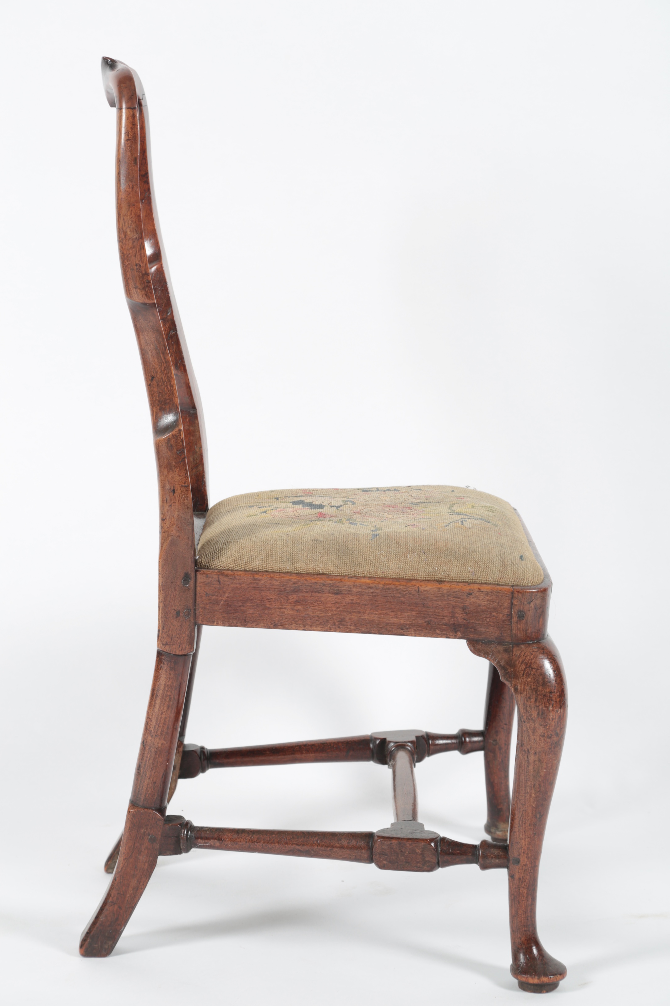 A George II walnut side chair, with vase splat and floral gros point drop in seat on cabriole front legs with turned H stretcher, 52cm wide, 62cm deep, 97cm high