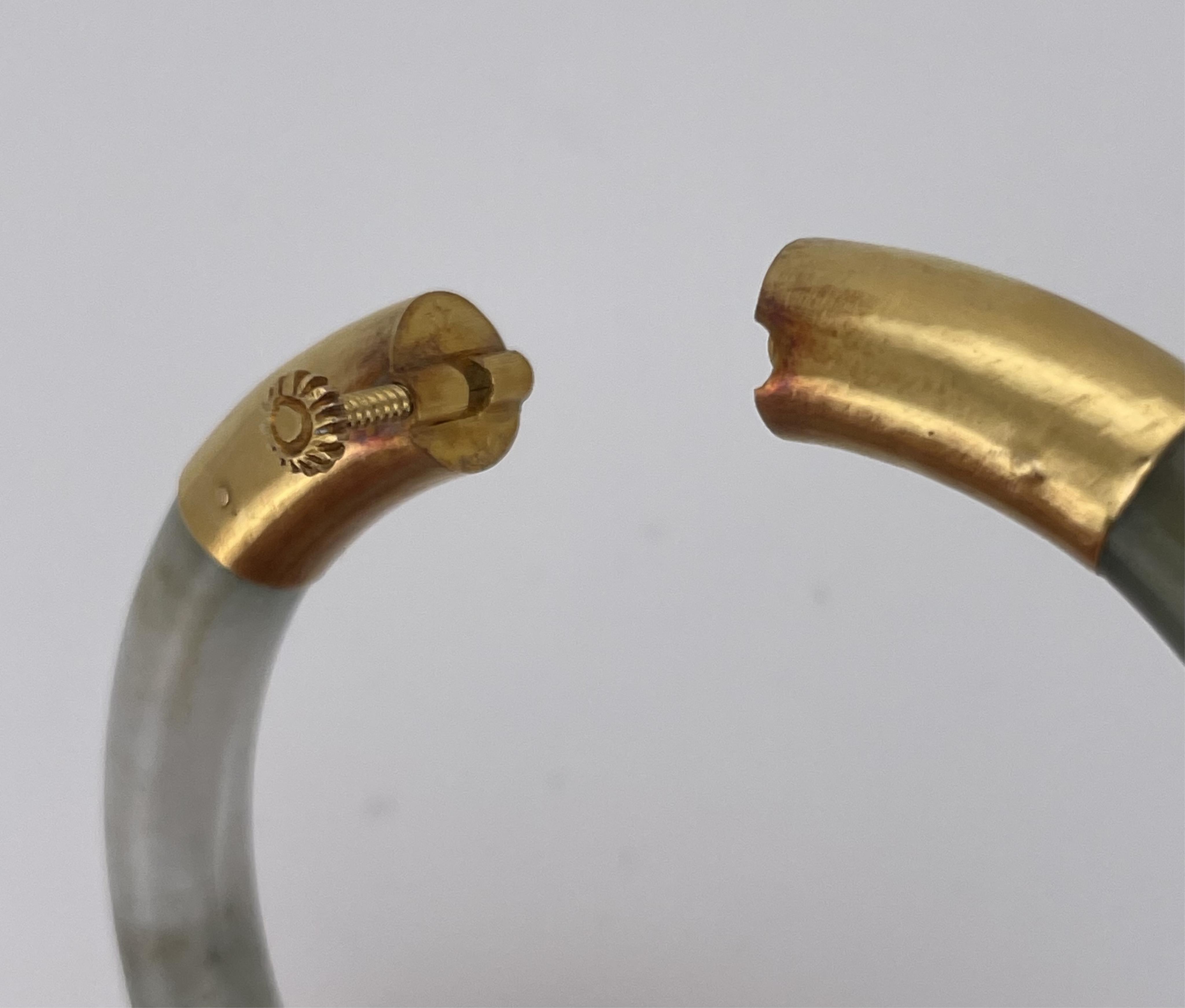 Lot 1933 , A jadeite and gold bangle, of hinged design, composed of a jadeite hoop mounted in gold, inner circumference approximately 15cm, stamped 22K