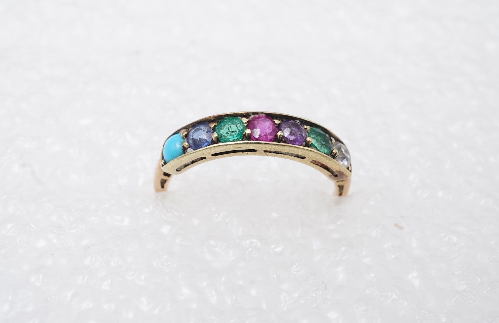 A multi-gem acrostic ring, mid 20th century, set with a sequence of diamond, emerald, amethyst, ruby, emerald, sapphire and turquoise, their initials spelling 'DEAREST', mounted in gold, size M, gross weight approximately 1.5 grams