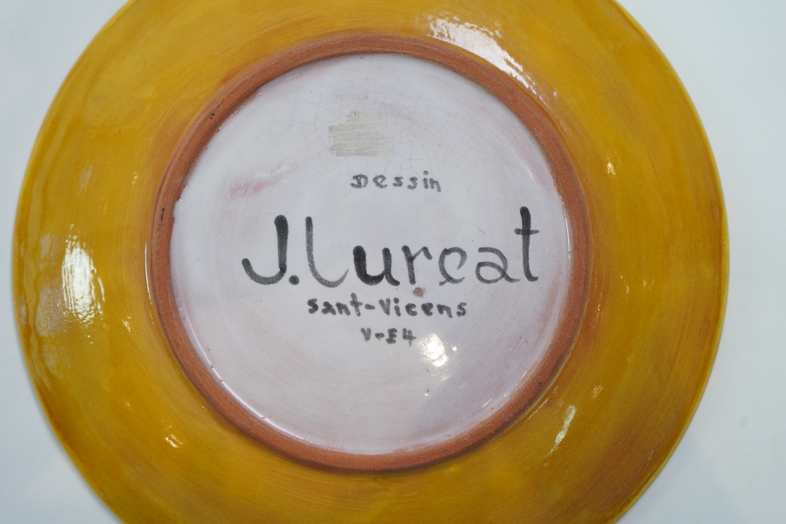 § Jean Lurçat (1892-1966): A yellow glazed earthenware plate, decorated with a stylised central figure, painted marks to the underside "Dessin J. Lurcat Sant-Vicens V-E4", 21.3cm diameter