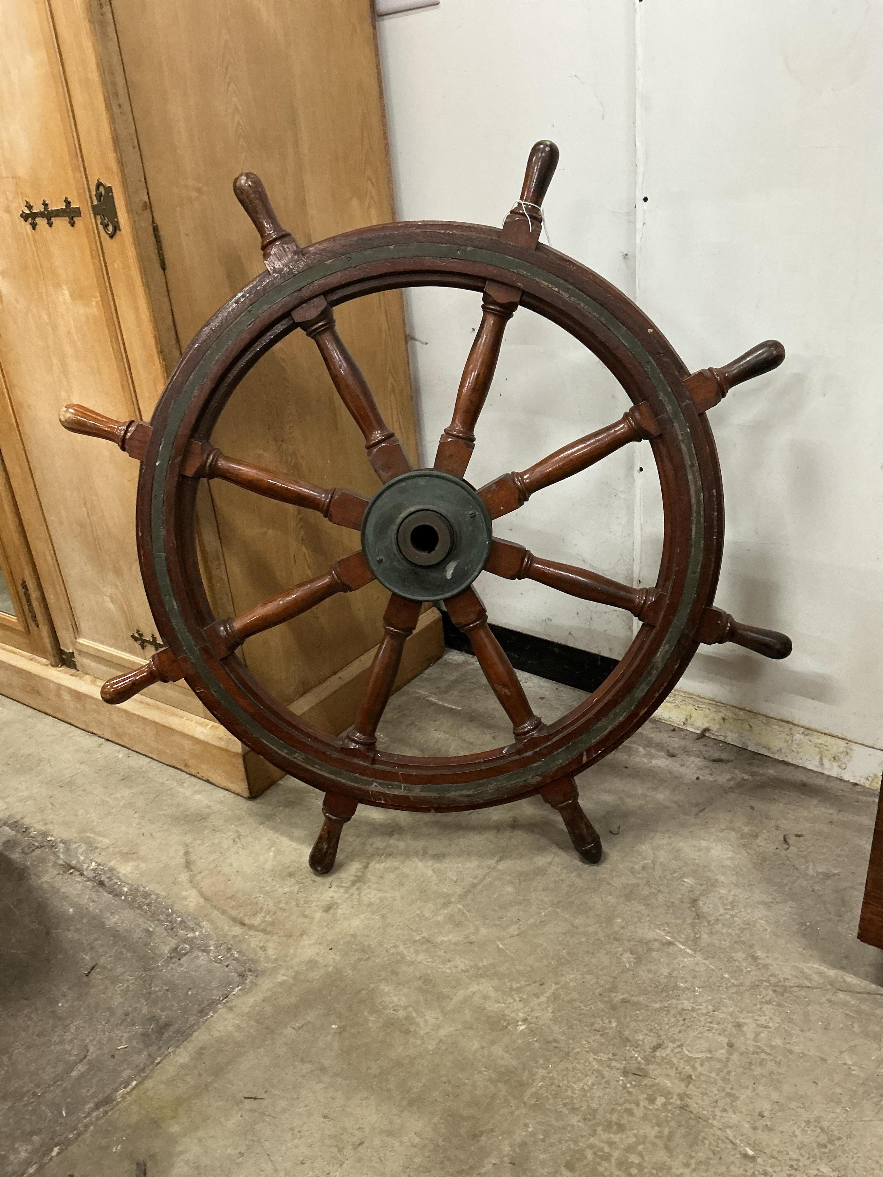 Lot 11 , An early 20th century brass mounted teak ships wheel, diameter 114cm