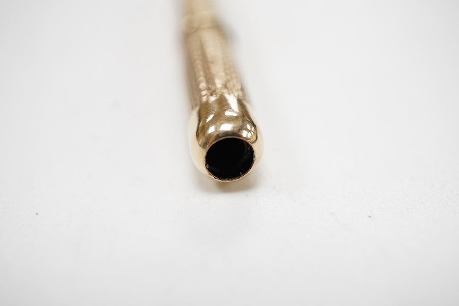 A 1960's engine turned 9ct gold cased toothpick, by S.J. Rose & Son Birmingham, 1961, 44mm. (a.f.).