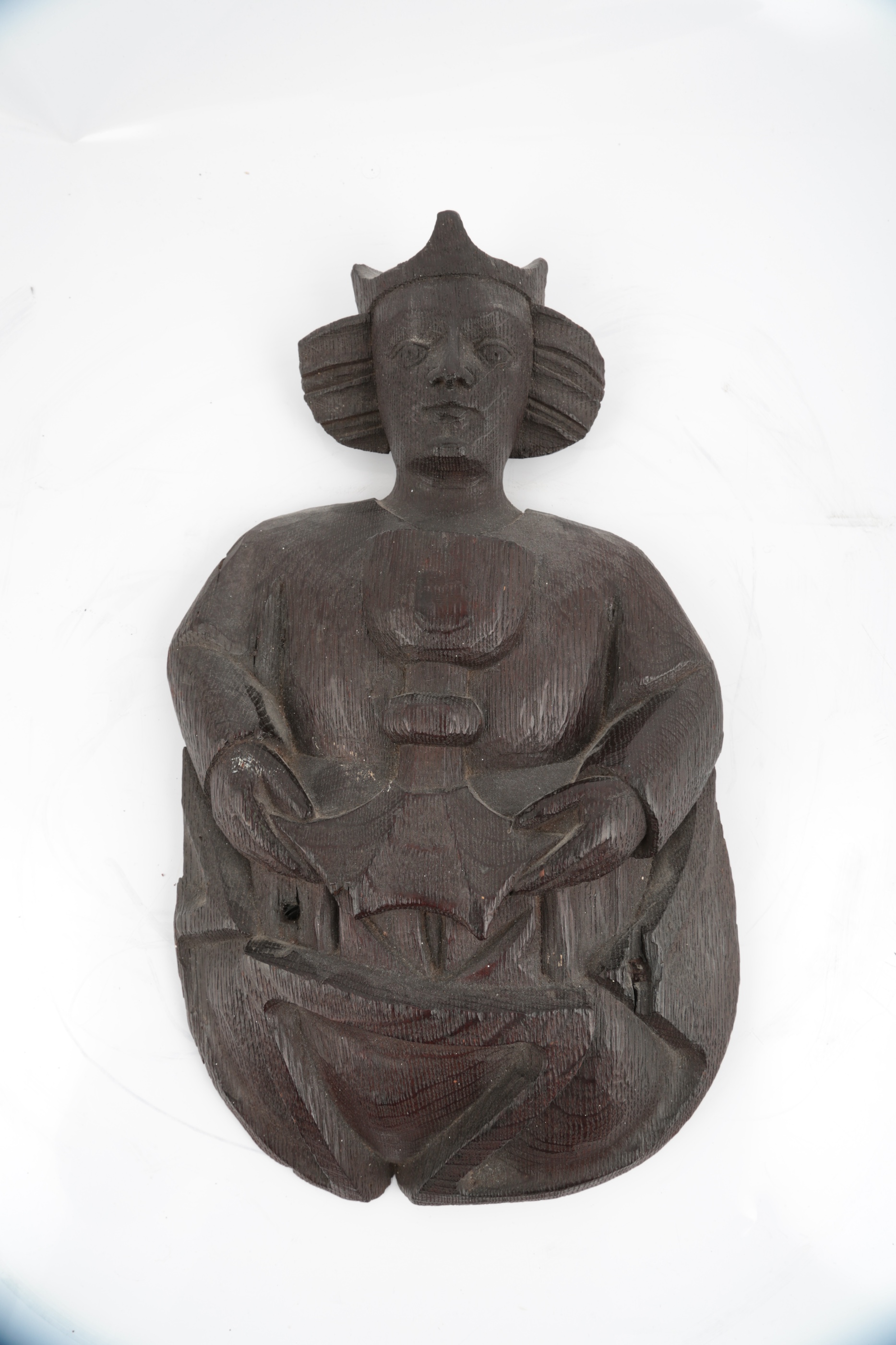 the first carved as an angel or monk holding a chalice, reminiscent of silver chalices made in Northern Europe in the late 15th century, such as the Coombe Keynes Chalice, the second holding a book of liturgy and the third possibly holding a chasuble, 35cm high