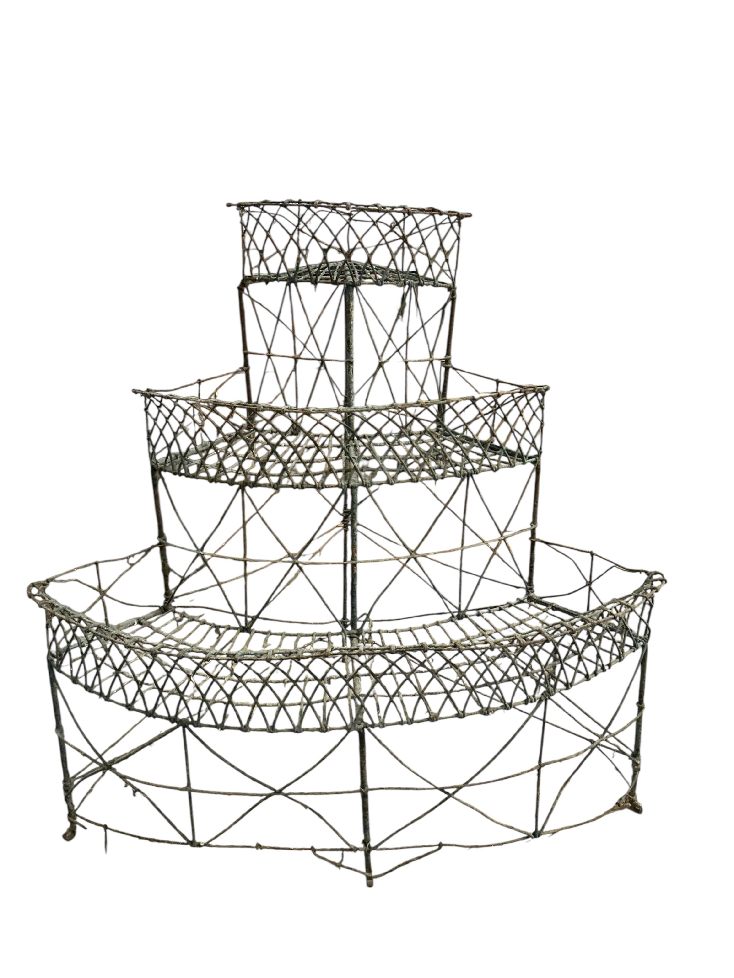 Lot 72 , A pair of Victorian wirework three tier bowfront plant stands, each width 100cm, depth 78cm, height 102cm