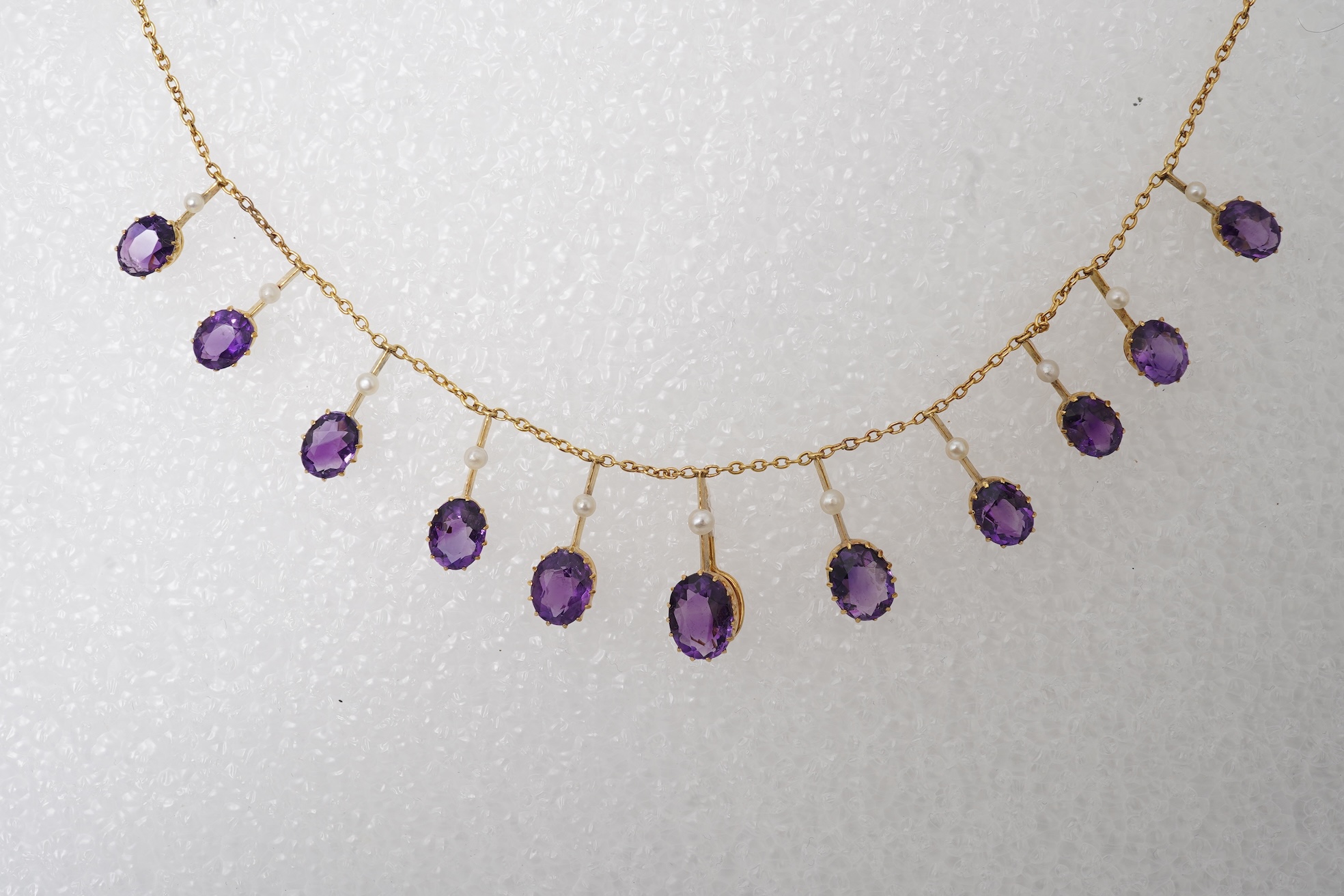 A Victorian amethyst and seed pearl necklace, late 19th century, designed as a fringe of graduated oval amethyst and seed pearl pendants set on knife wire, to a belcher link chain, mounted in gold, length approximately 40cm, longest pendant 2cm, gross weight approximately 9 grams, pearls untested, case stamped Robert Jones & Sons