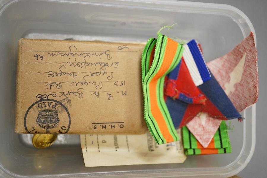 Eighteen First World War and WWII medals, First World War medal groups including; a trio to 14072 Pte. F.N. Slee A.S.C., a pair to 125019 Gnr. W.T. Garlick. R.A., a pair to one 107319 Gnr. A.G. Davidson. R.A., a pair to 1542 Pte. H. Barrett. R. WAR. R., a 1914-1918 medal to 123223 Pte. H. Downs. M.G.C., and a territorial medal, plus a four medal group to G-23315 Pte. W. Bacon. MIDD’X R., three WWII medals, a card issue box and a small number of cat badges, buttons, and spare ribbons