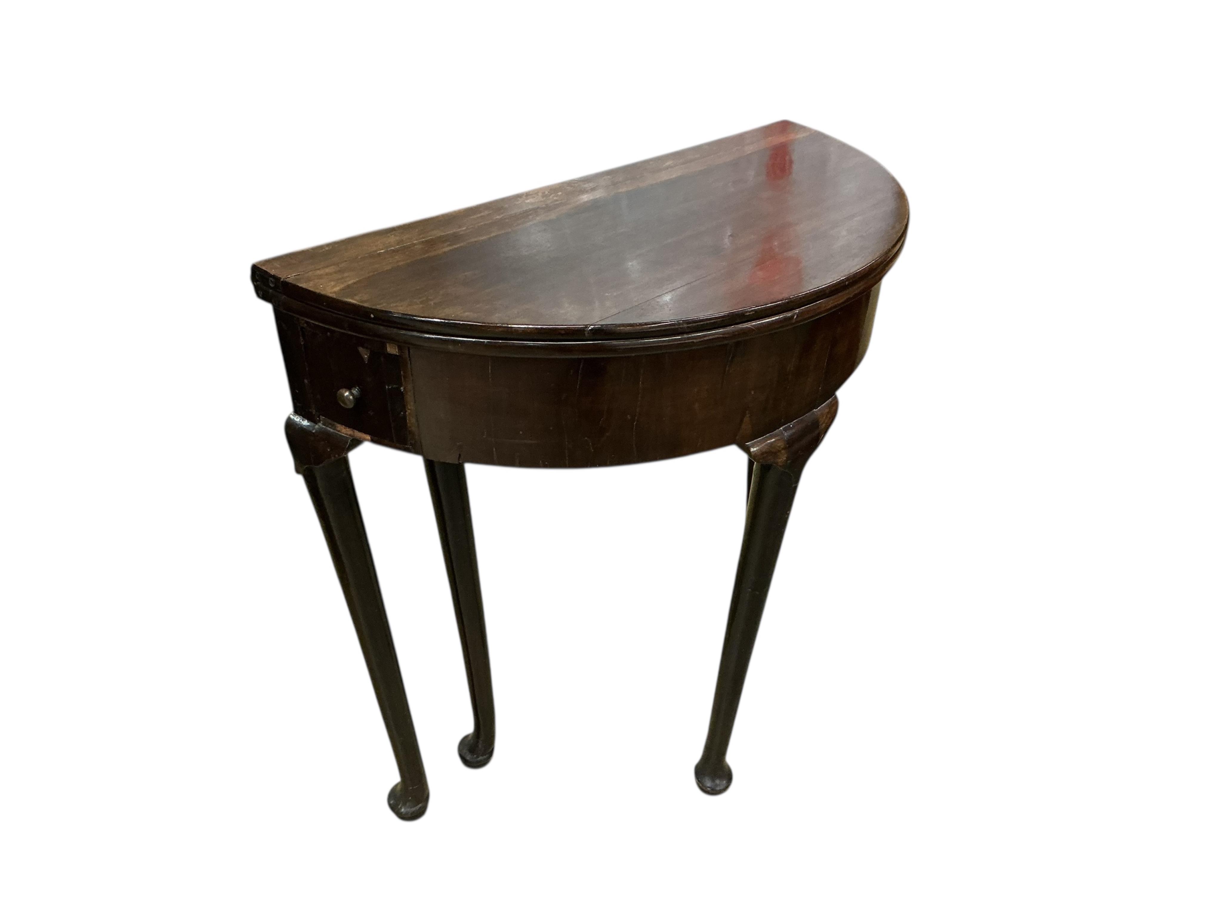 A George III mahogany demi-lune folding tea table, width 76cm, depth 37cm, height 73cm