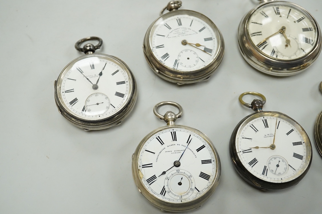 Seven assorted mainly early 20th century silver open faced pocket watches including Kendall & Dent, case diameter 51mm and Waltham, together with a late Victorian silver hunter pocket watch(a.f.).