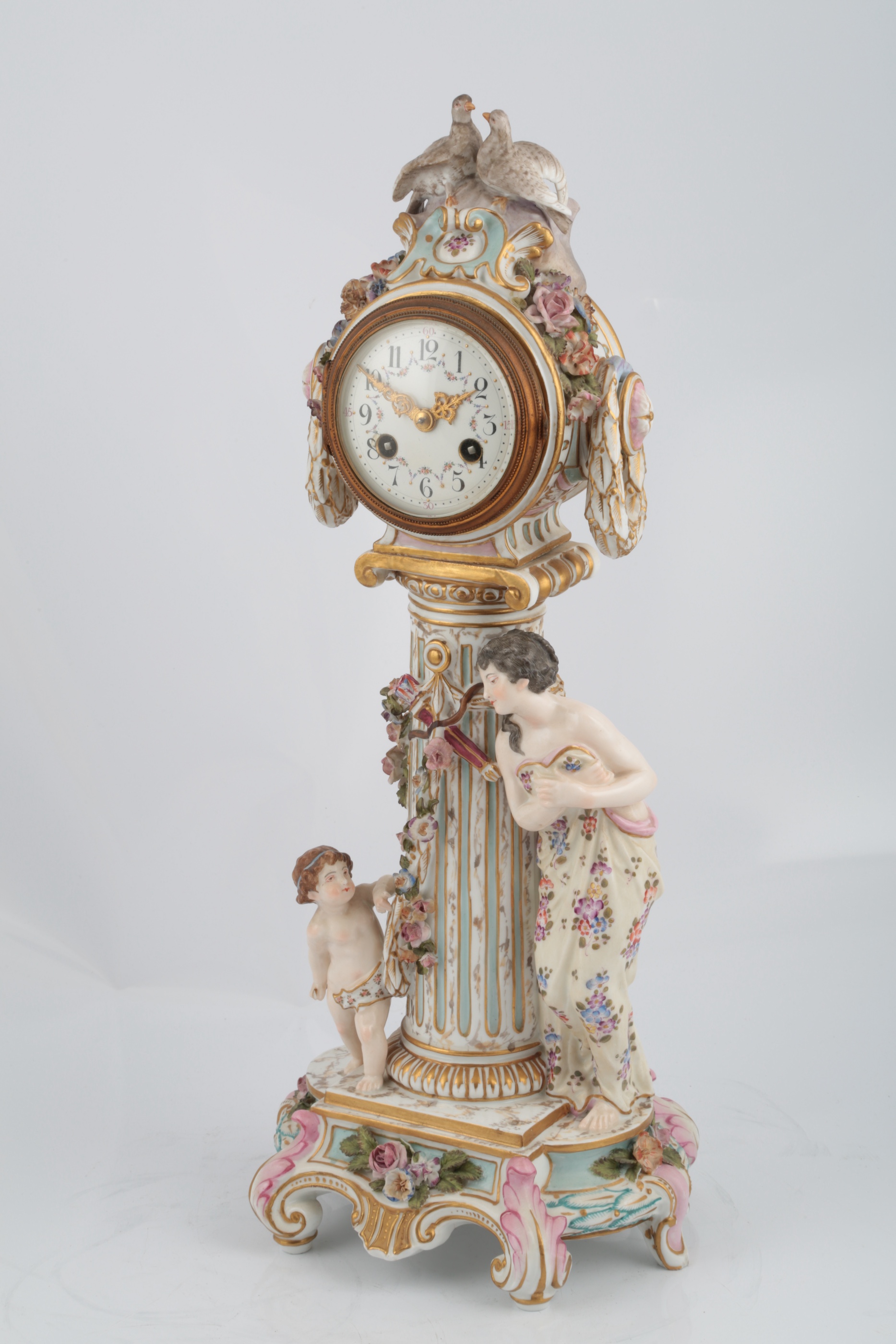 the case modelled as a column with the figures of Cupid and Psyche to each side surmounted by a drum shaped movement, the enamel dial with Arabic numerals, with twin dove surmount, pseudo crossed swords mark, 45.5cm high