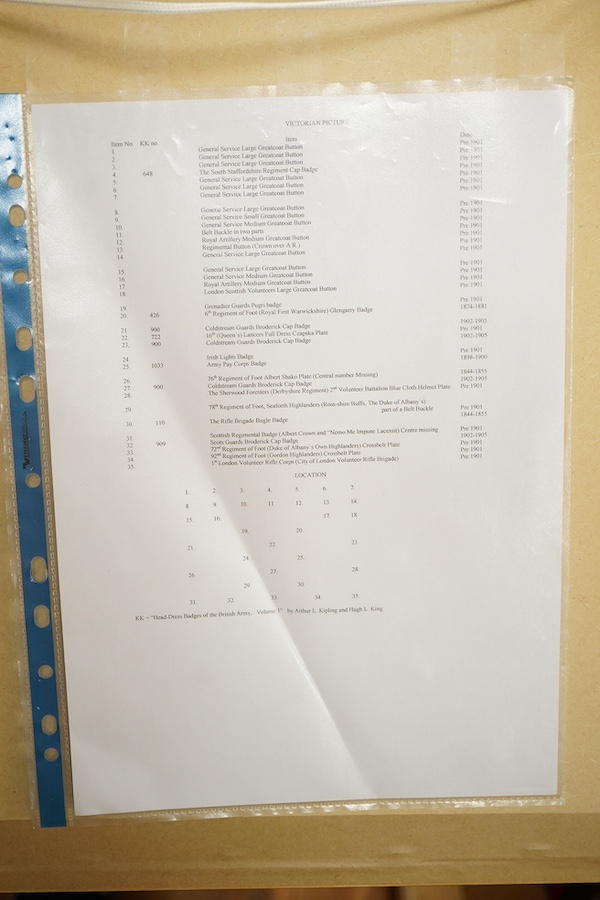 Lot 59 , A framed and glazed collection of late 19th century military badges and buttons, including; a 16th Lancers Czapska plate, a Royal 1st Warwickshire Glengarry badge, two Coldstream guards Broderick cap badge, a Seaforth Hi
