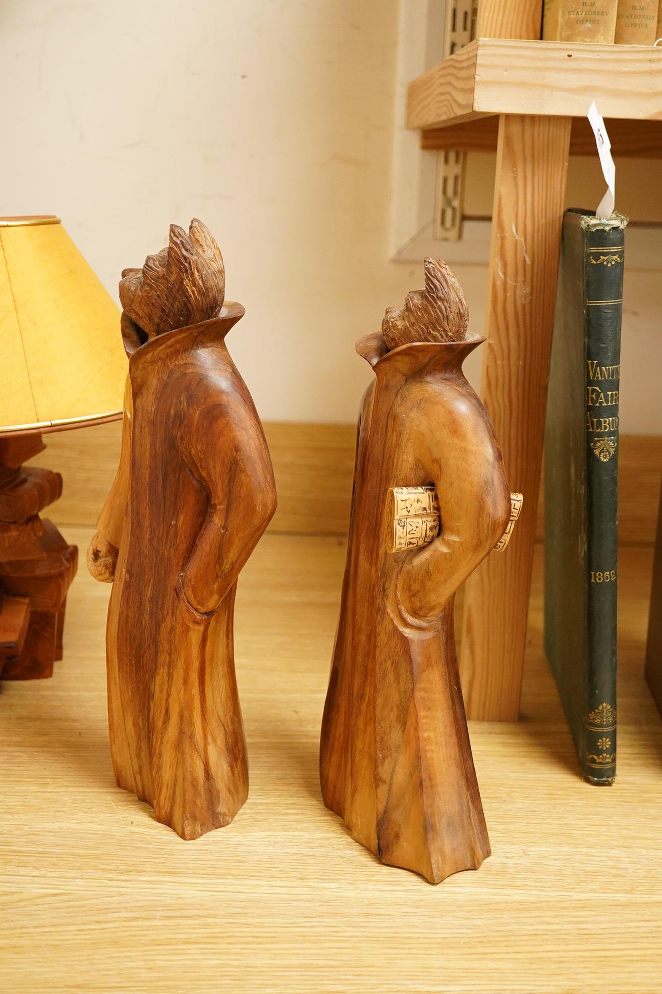 Pierre Decorse (b.1953), a pair of carved hardwood cats and a novelty lamp modelled as a stack of books, with shade, largest overall 36cm high