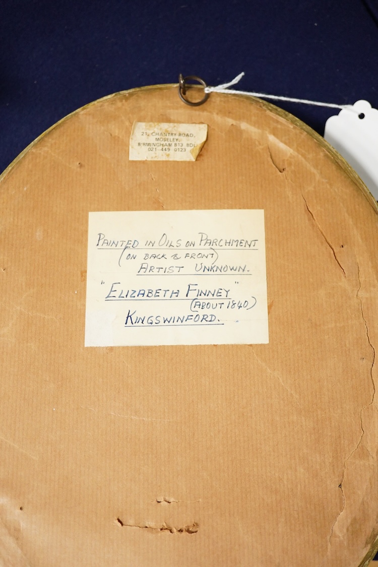 English School, 19th century, portrait of Elizabeth Finney, c.1840, details verso, oval oil on parchment, 17 x 12cm