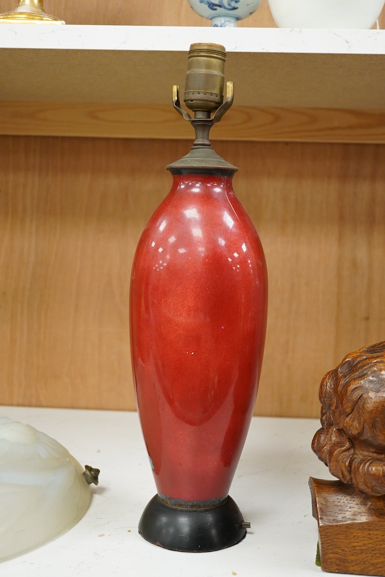 A Japanese cloisonne red ground bird decorated lamp, 44.5cm high including fitting