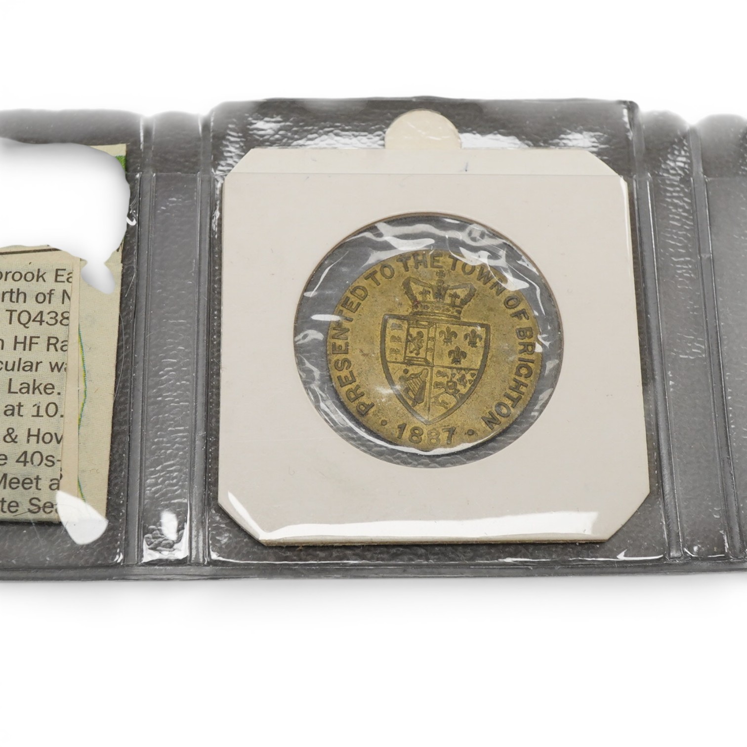 A late 18th/early 19th century Shoreham toll bridge pass showing the arms of the Earl of Surrey, blank on the reverse, together with three Brighton Corporation Tramways post office staff tokens; two 1d and a 1 1/2d, a Lewes Co-op Society 2lb loaf token, and an 1887 Willing’s Clock Tower commemorative medal