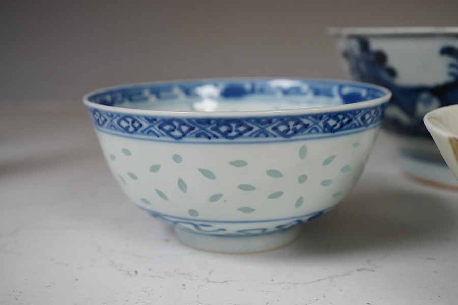 Lot 1328 , Three Chinese blue and white bowls, and an enamelled dish, latter 12cm