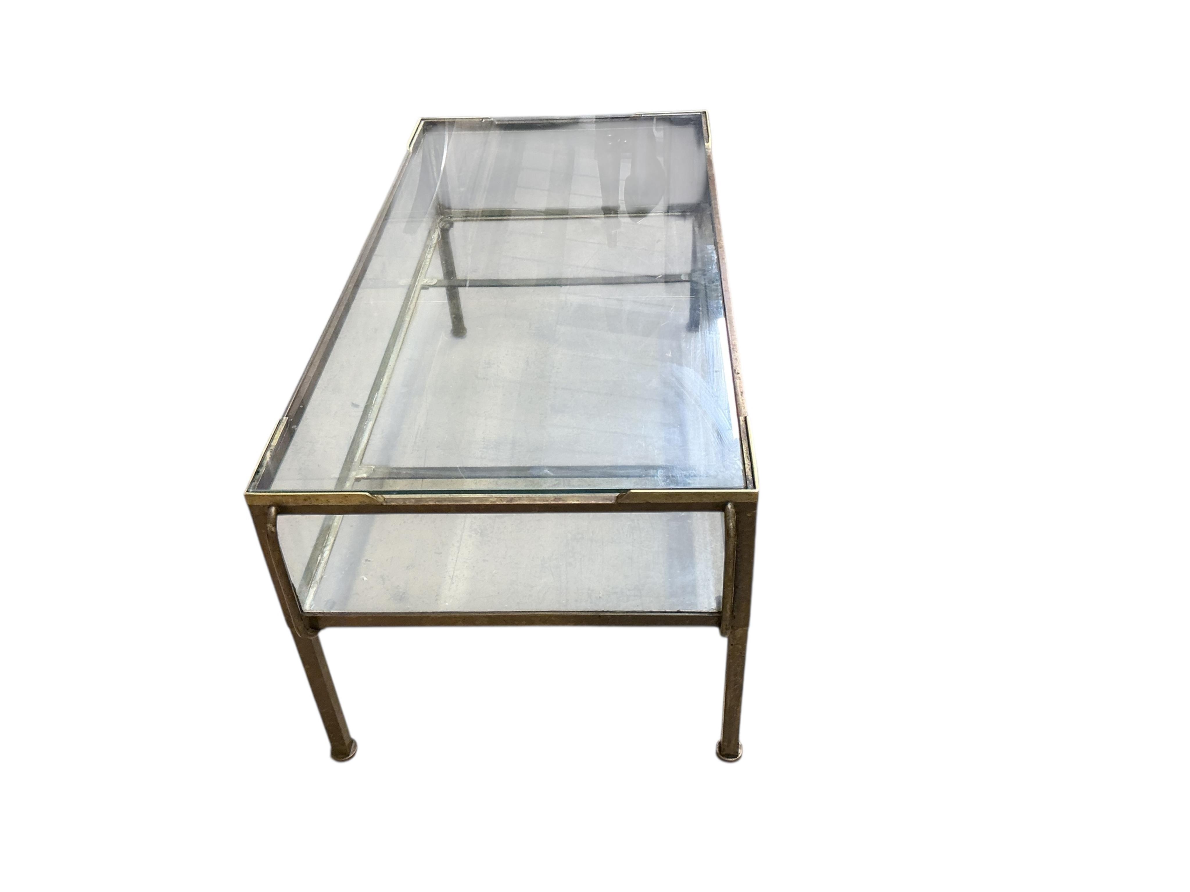 A mid century brass and glass display coffee table with removable rectangular top, width 96cm, depth 46cm, height 41cm.
