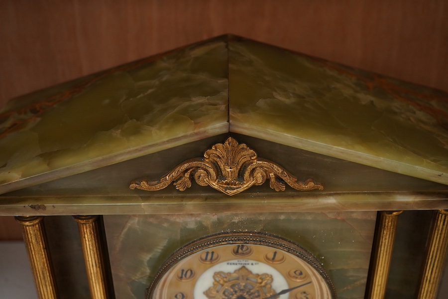 A late 19th / early 20th century green onyx architectural mantel clock with Arabic numeral dial, striking on a coiled gong, with pendulum, 28cm high