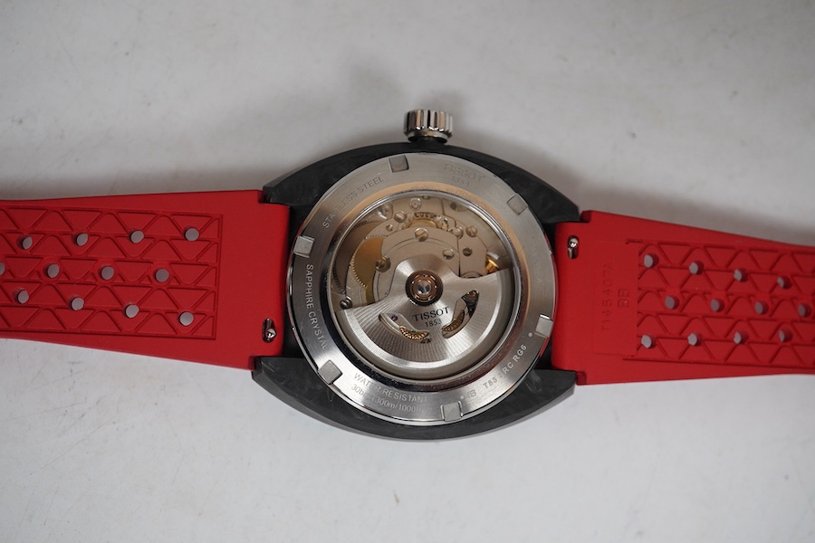 Lot 1094 , A gentleman's recent blackened stainless steel Tissot Powermatic 80 wrist watch, case diameter 40mm, on a Tissot red rubber strap, with box