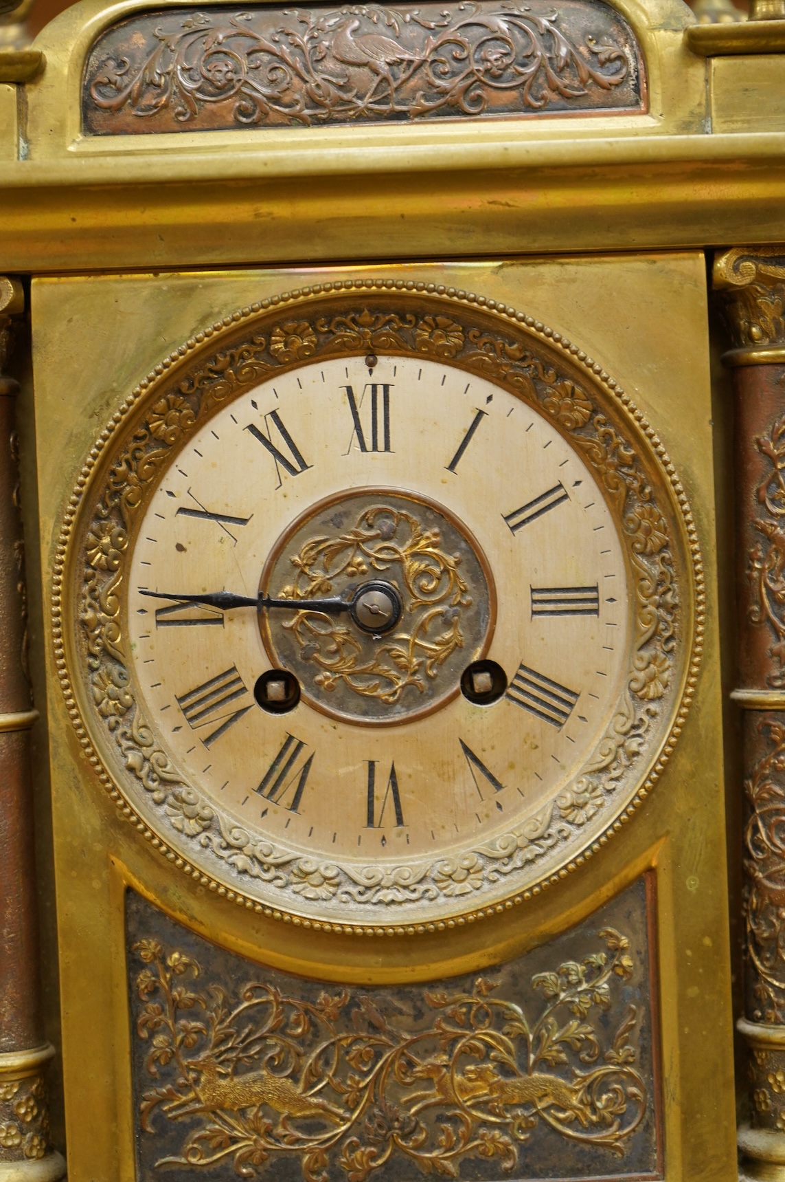 A late 19th century brass mantel clock with French gong-striking movement, 38cm high