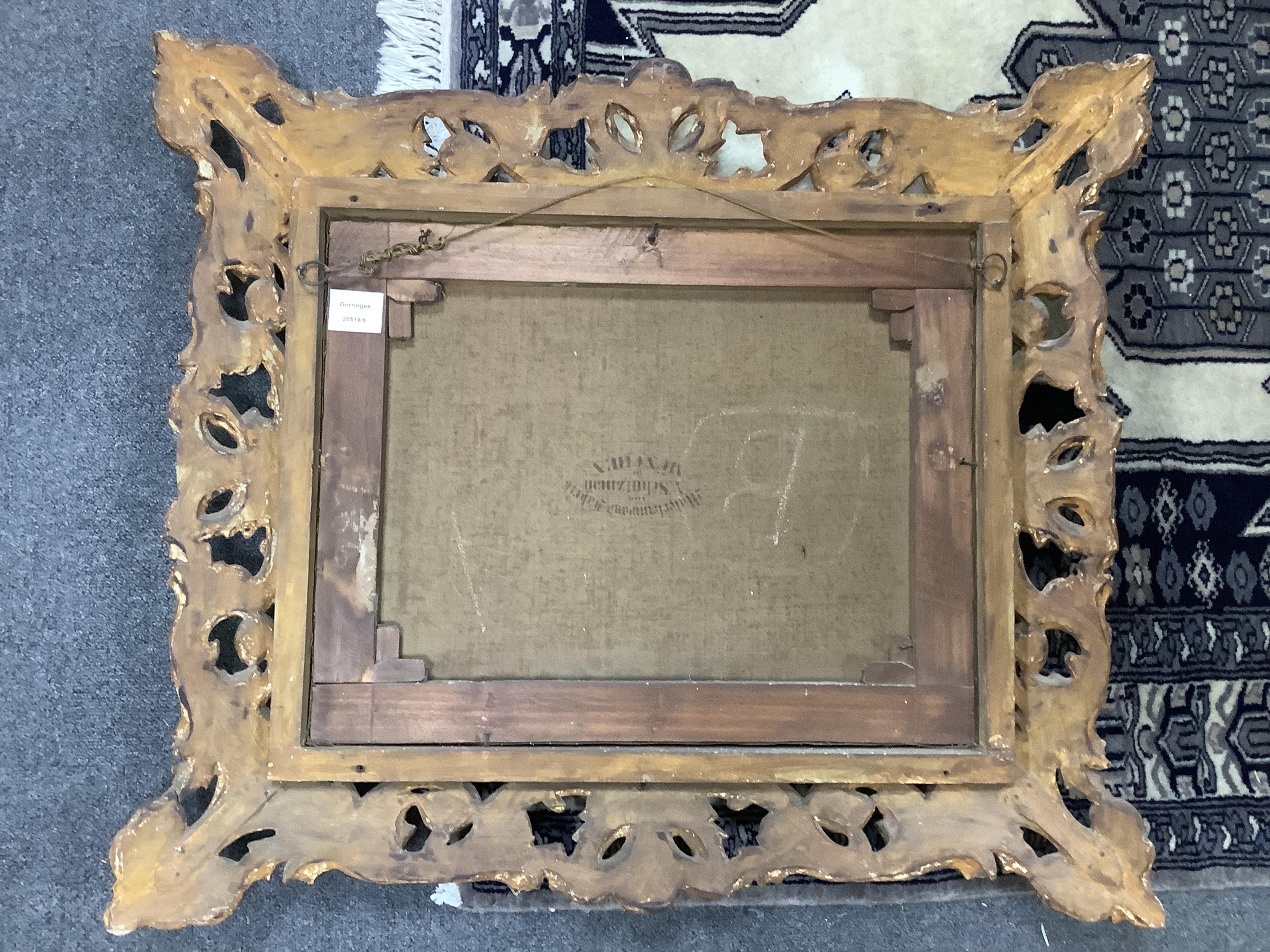 Tear to centre left of canvas, foxing / spotting mainly to sky, craquelure - predominantly to trees on either side. Minor cracking to frame - commensurate with age. Canvas would benefit from a clean.