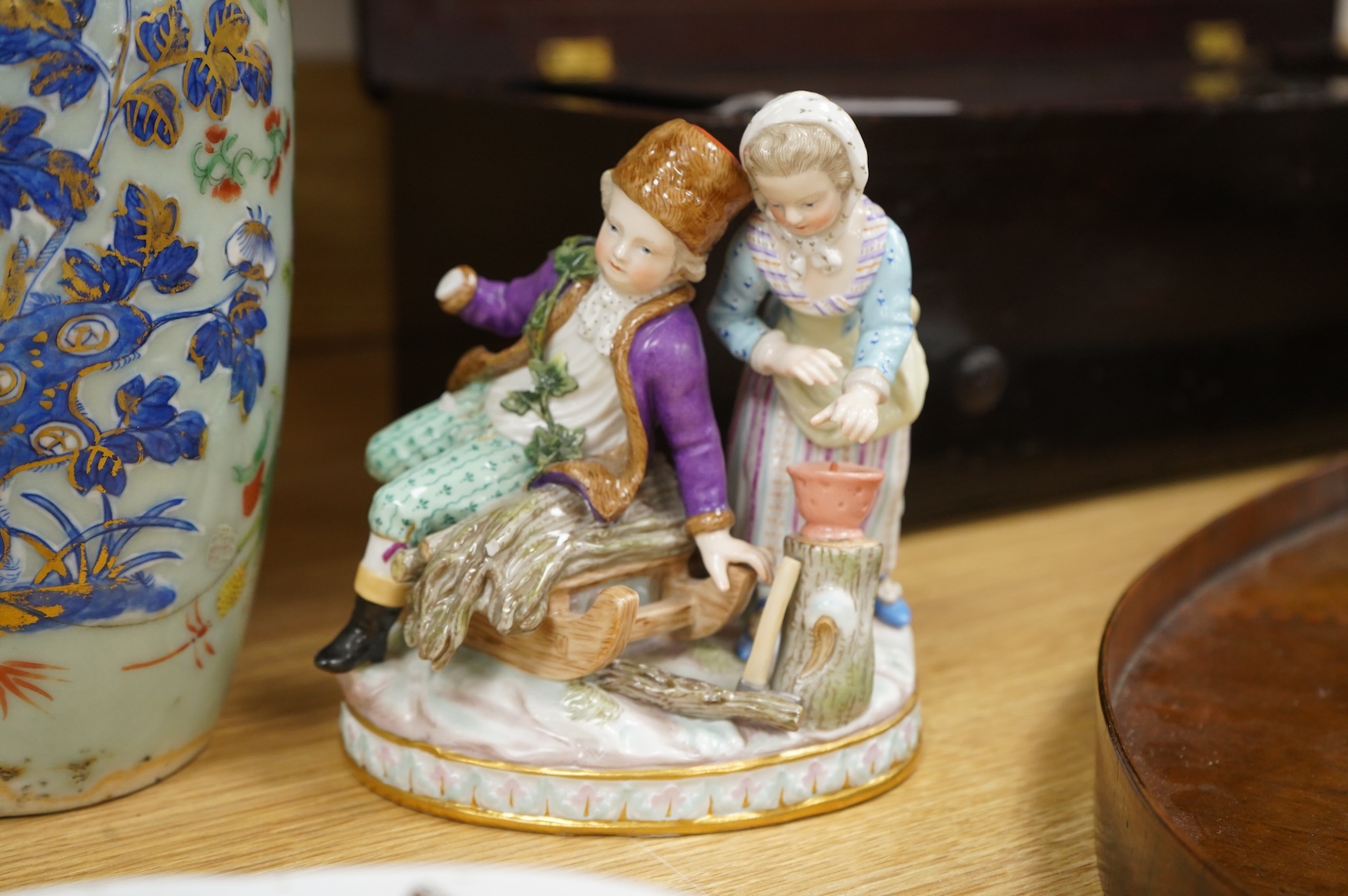 Lot 271 , A Meissen relief-moulded and gilded dish, a Meissen figure group emblematic of Winter and two 19th century Chinese porcelain vases, dish 29cm
