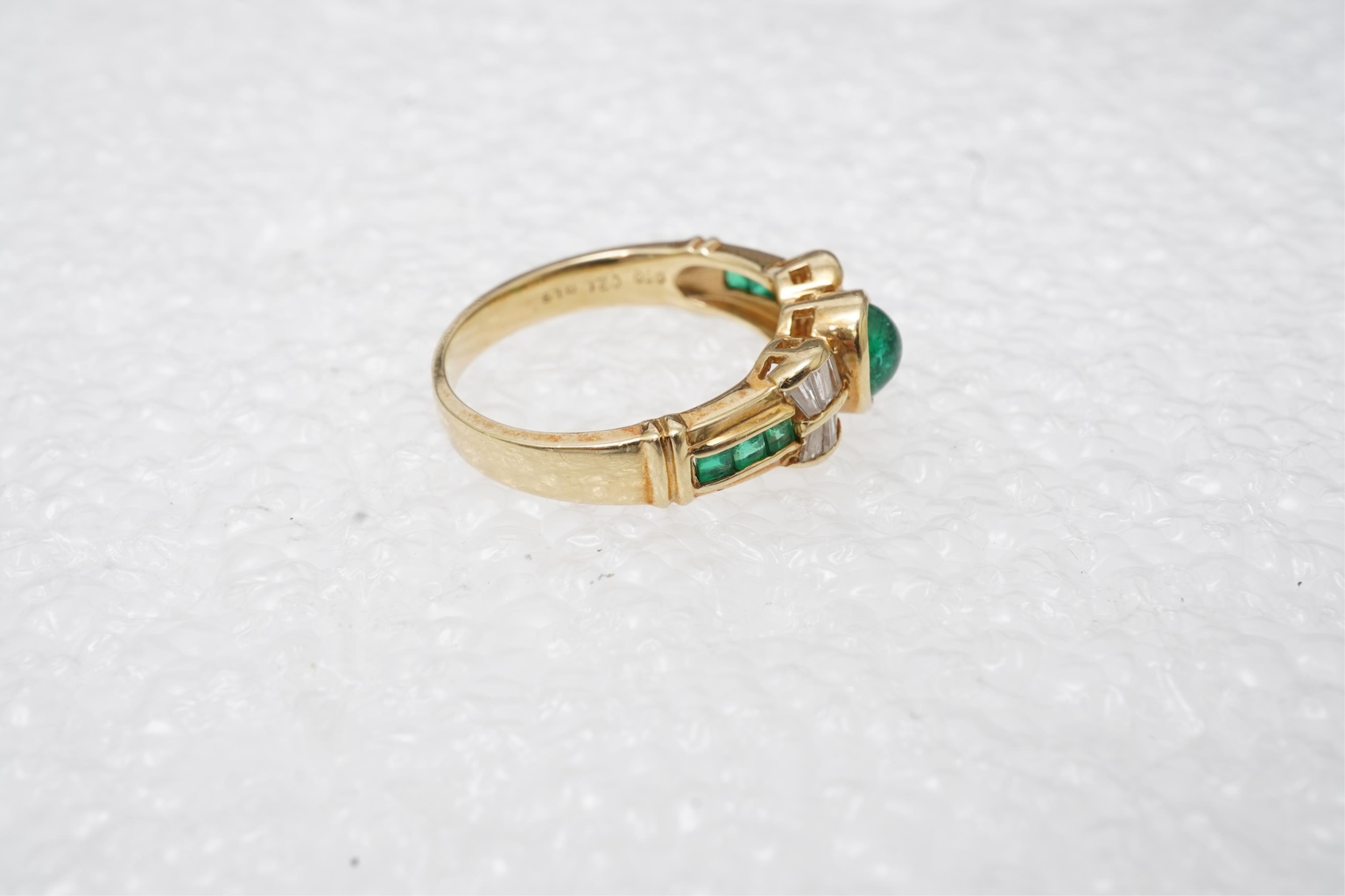 An emerald and diamond ring, collet-set with a cabochon emerald weighing approximately 0.45 carats, to shoulders set with tapered baguette diamonds totalling approximately 0.20 carats, and lines of channel-set calibré-cut emeralds, mounted in gold, size K1/2, stamped K18, gross weight approximately 4.4 grams