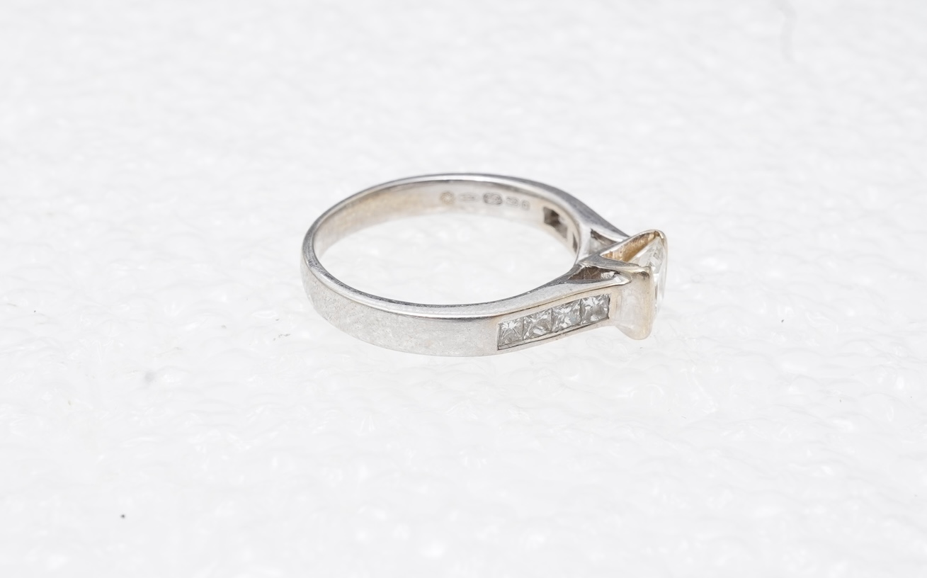 A diamond ring, tension-set with a princess-cut diamond weighing approximately 0.50 carats, to shoulders channel-set with smaller princess-cut diamonds totalling approximately 0.40 carats, mounted in 18ct white gold, size K1/2, British hallmarks, gross weight approximately 3.4 grams