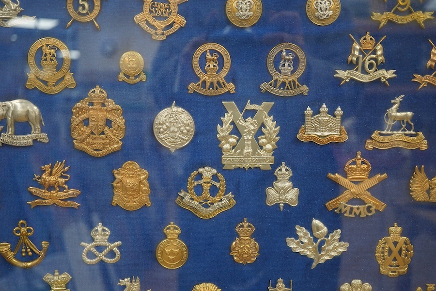 Lot 63 , A framed and glazed display of military cap badges and Glengarry badges, including; The Royal Scots, the Queen’s Royal West Surrey regiment, the Norfolk regiment, the Lincolnshire regiment, the Bedfordshire regiment, the