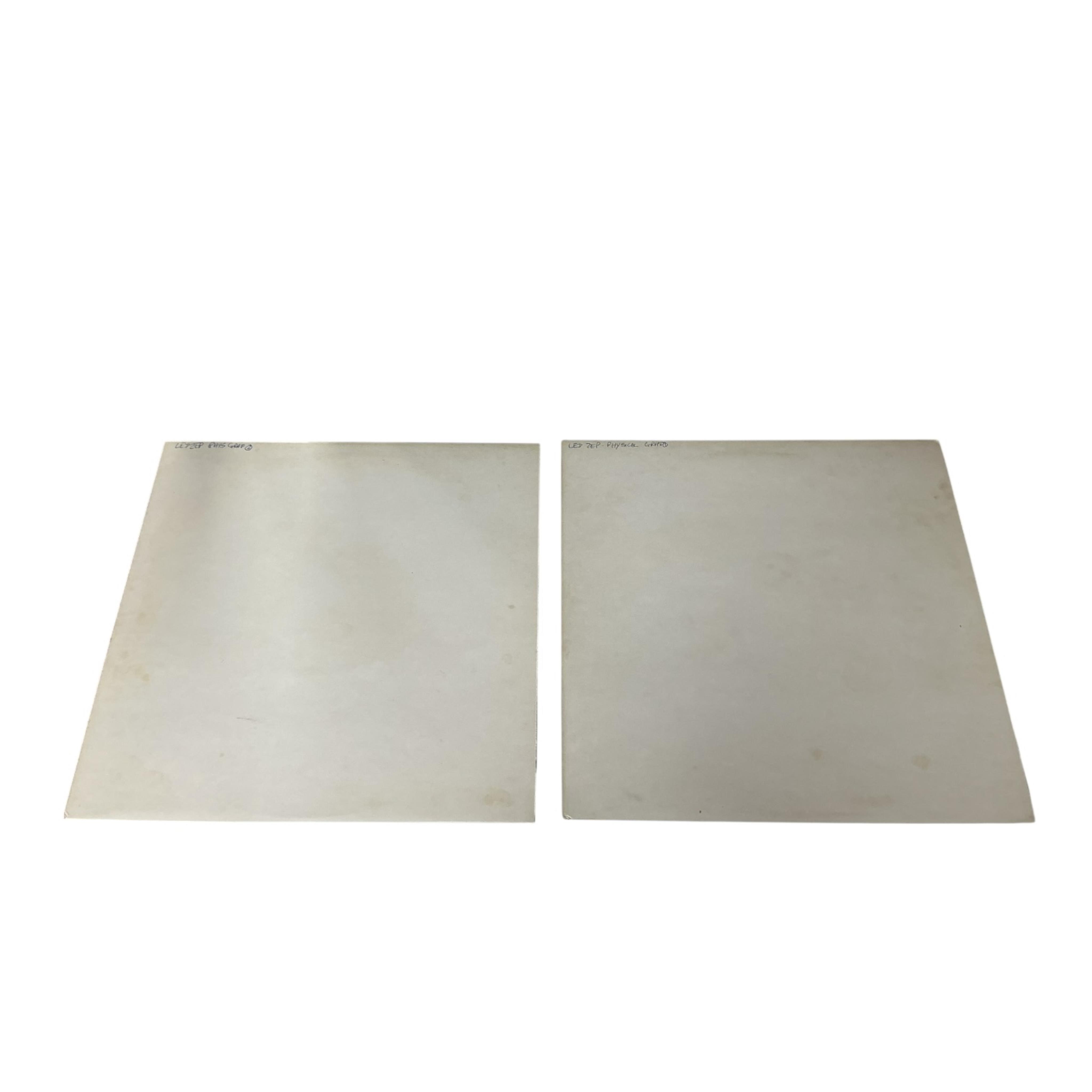 An original Atlantic white label promo LP of Led Zeppelin; Physical Graffiti, double album with unmarked white labels to all four sides, matrix numbers; SSK.89400.A1, SSK.89400.B1, SSK.89400.C1, and SSK.89400.D1, both records housed in separate white inner and outer sleeves, the only markings; a handwritten ink title to the top corner of each outer sleeve reading; ‘LED ZEP - PHYS GRAF’