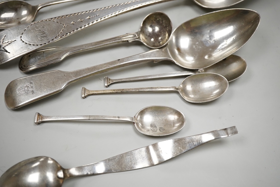 Fifteen items of sundry silver flatware, to include a George III bright cut engraved table spoon, John Bayly, Dublin, 1805, a set of six George V coffee spoons, three teaspoons, a mustard ladle, a dessert spoon, a pair o