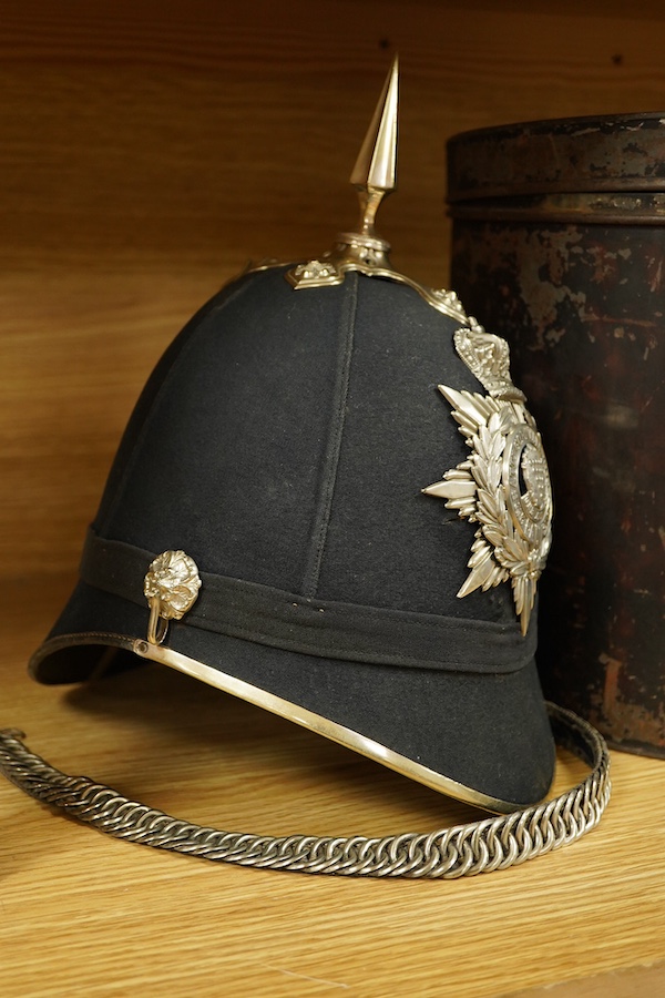 A late 19th century British Officer’s helmet for the 2nd Battalion Cornwall Rifle Volunteers, covered in black cloth, together with a helmet tin issued by Hobson & Sons, with an applied engraved brass owners label for Major R. Irvine, 4th Durham A.V.