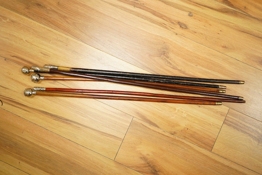 Six military swagger sticks, two with ebonised finish, all with white metal mounted tops, including; Princess Louise’s regiment, the Kent Cyclist Battalion, the Queen‘s Own West Kent regiment, etc.
