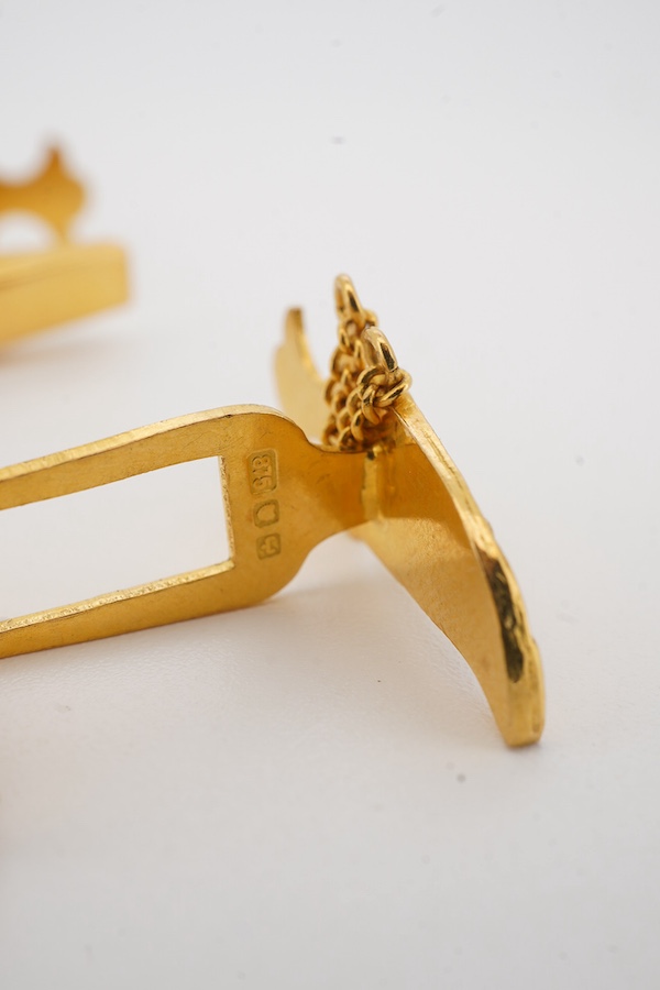Lot 1171 , A pair of gold cufflinks, Middle Eastern, each designed as a 'jambiya' dagger in sheath, in gold, length 2.4cm, assay marks, stamped 875, combined gross weight approximately 10.5 grams