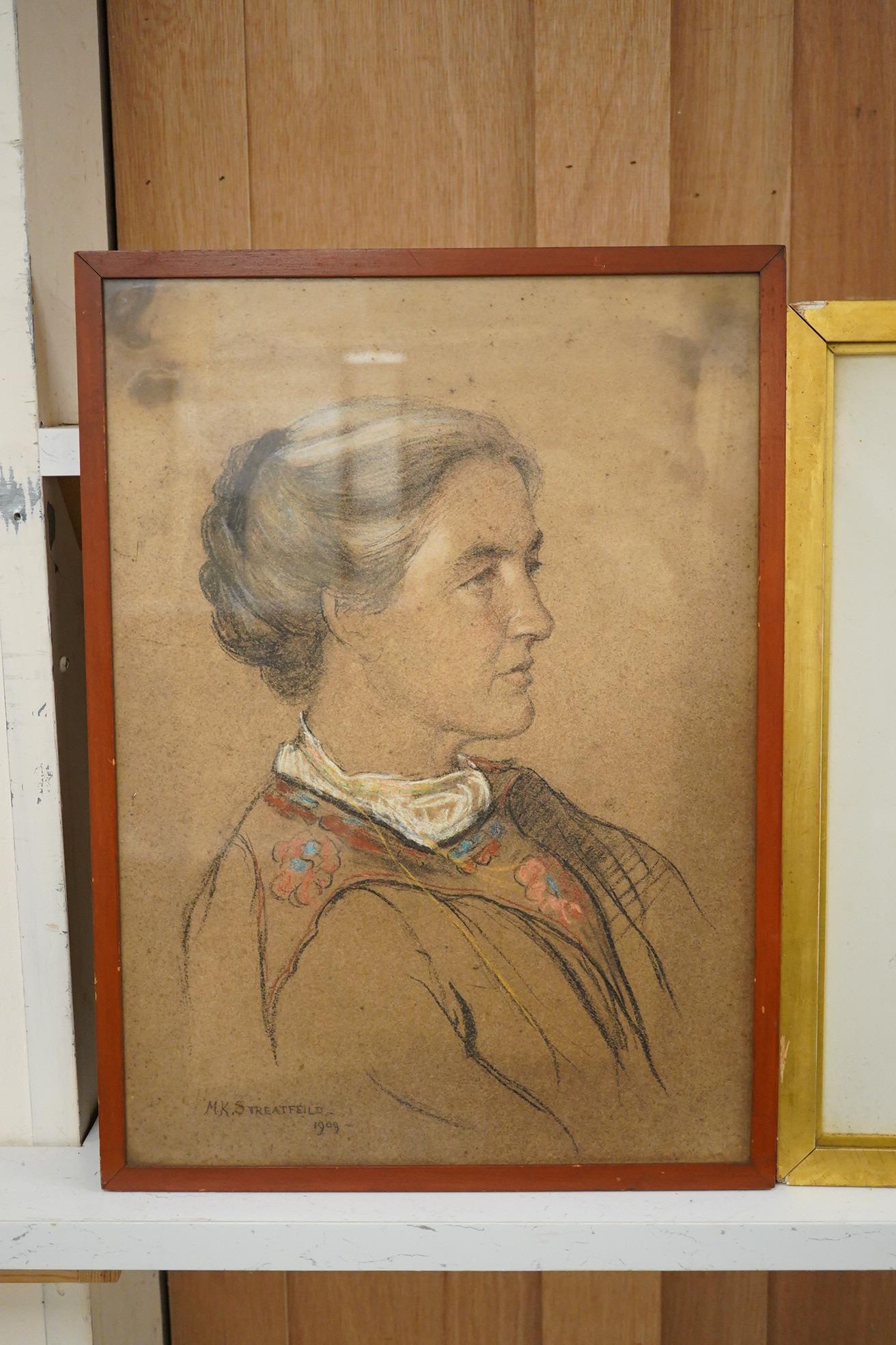 Lot 1713 , M K Streatfeild, portrait of a lady, signed and dated 1909, pastels, together with an Art Deco pencil study of a lady, monogrammed and dated 1926, largest 42 x 30cm
