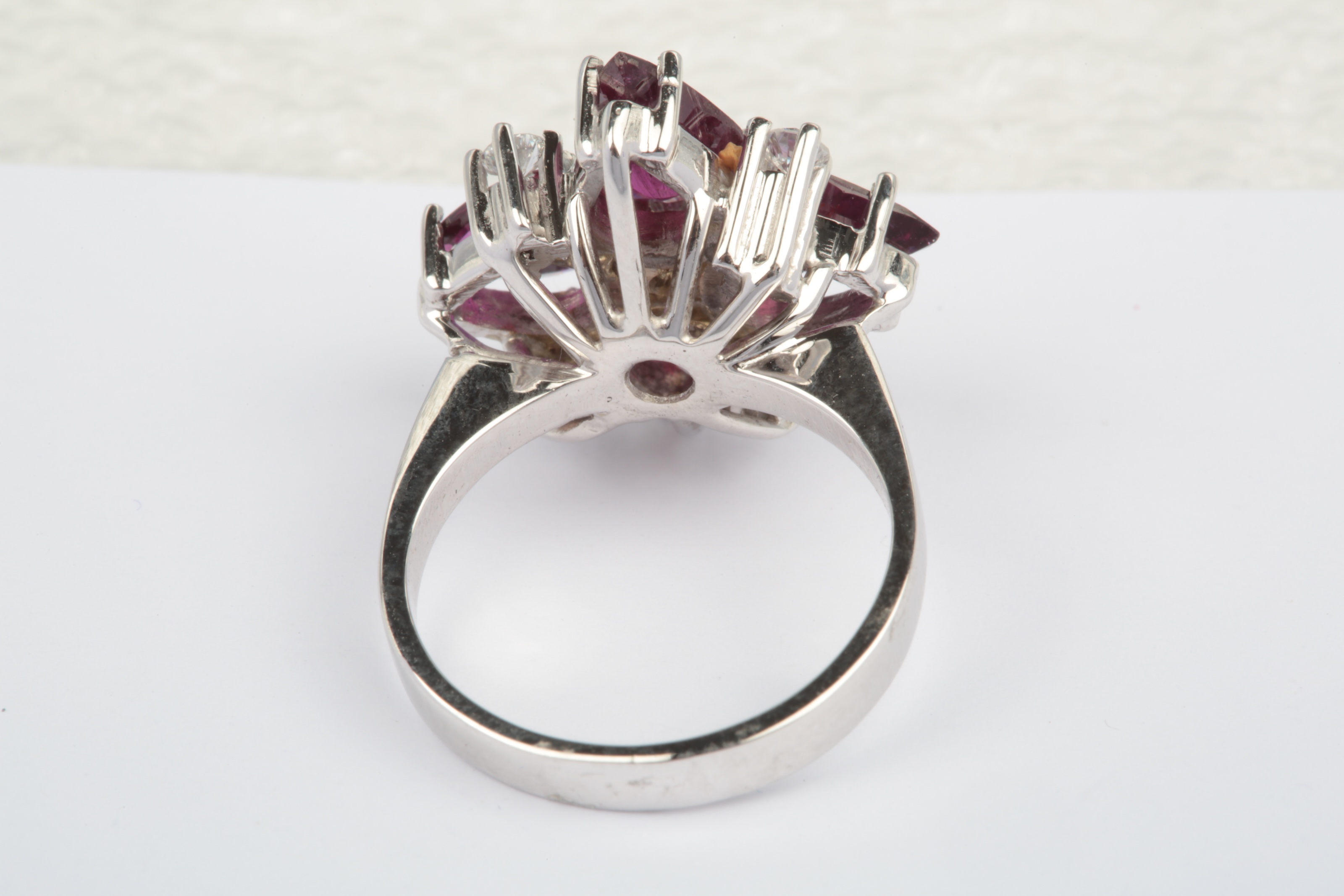 A ruby and diamond cluster ring, set with four pear-shaped rubies and five brilliant-cut diamonds in a quatrefoil arrangement, mounted in white gold, size J1/2, stamped 585, gross weight approximately 6 grams