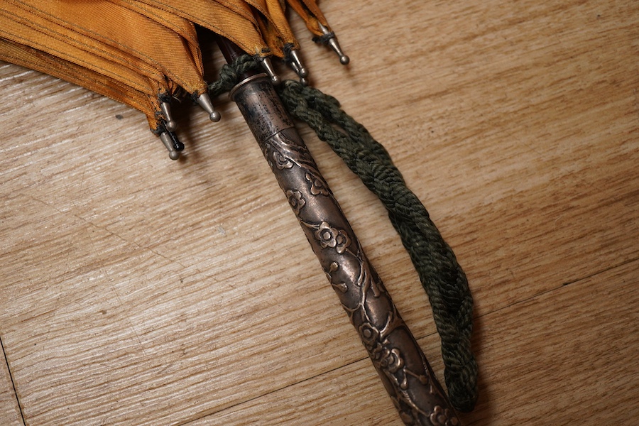 A Chinese white metal handled and gold silk parasol, 88cm long