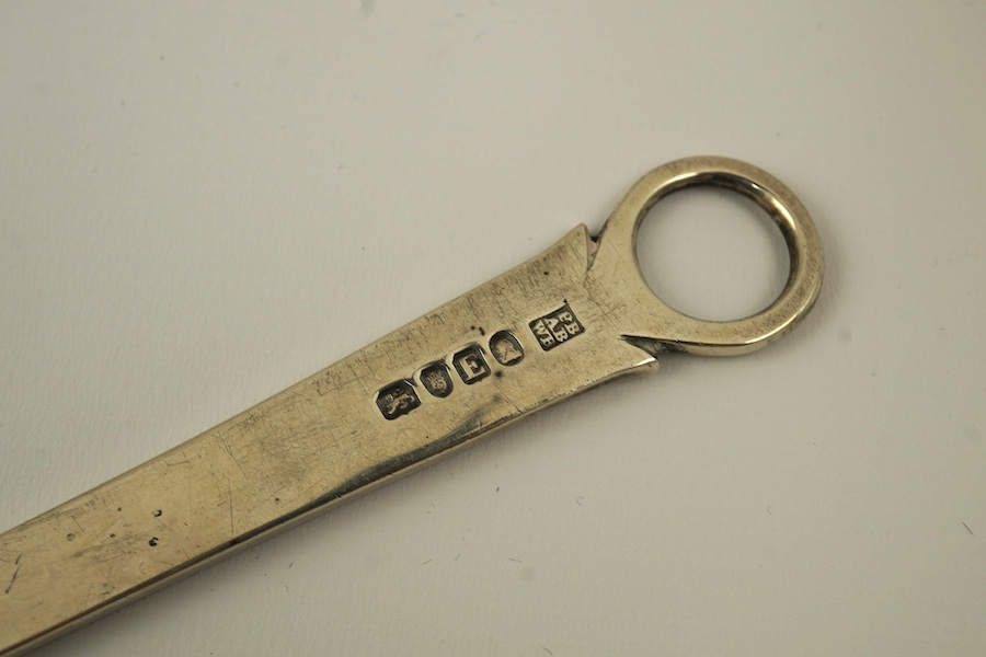 Minor nicks and surface scratches in places. More prominent scratch on one side. Slightly bowed when viewed from the side. A few tarnish marks. Hallmarks clear.