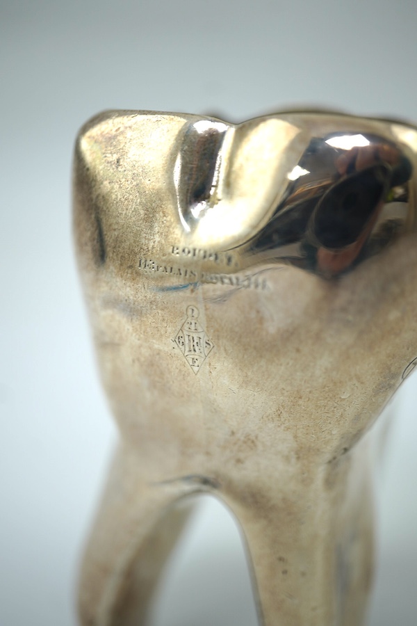 A rare Victorian novelty silver shot/measure, modelled as a molar, engraved ' Just a Toothful', by HW Ld?, retailed by Boulet, with PODR mark and gilded interior, London, 1875, height 8cm, 108 grams.