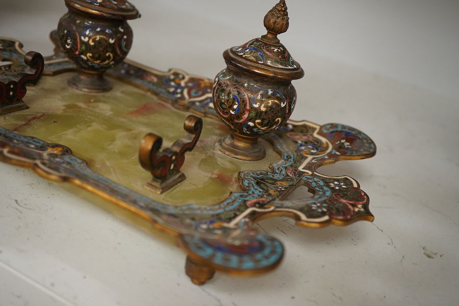 A late 19th century French champlevé enamel and onyx deskstand, 18 x 28cm.