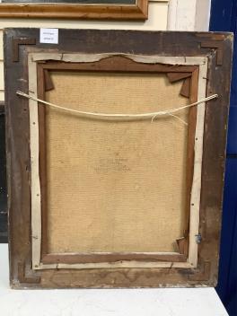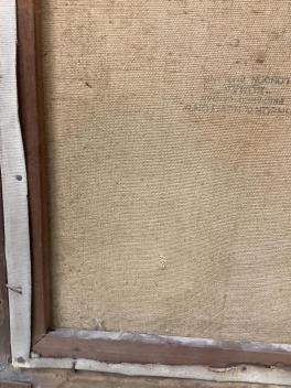 Five small tears to canvas, images 5 and 6; lower-left where paint is weak and barely covers the canvas; unsightly craquelure particularly affecting his face. Frame with rubs around each corner, not serious.
