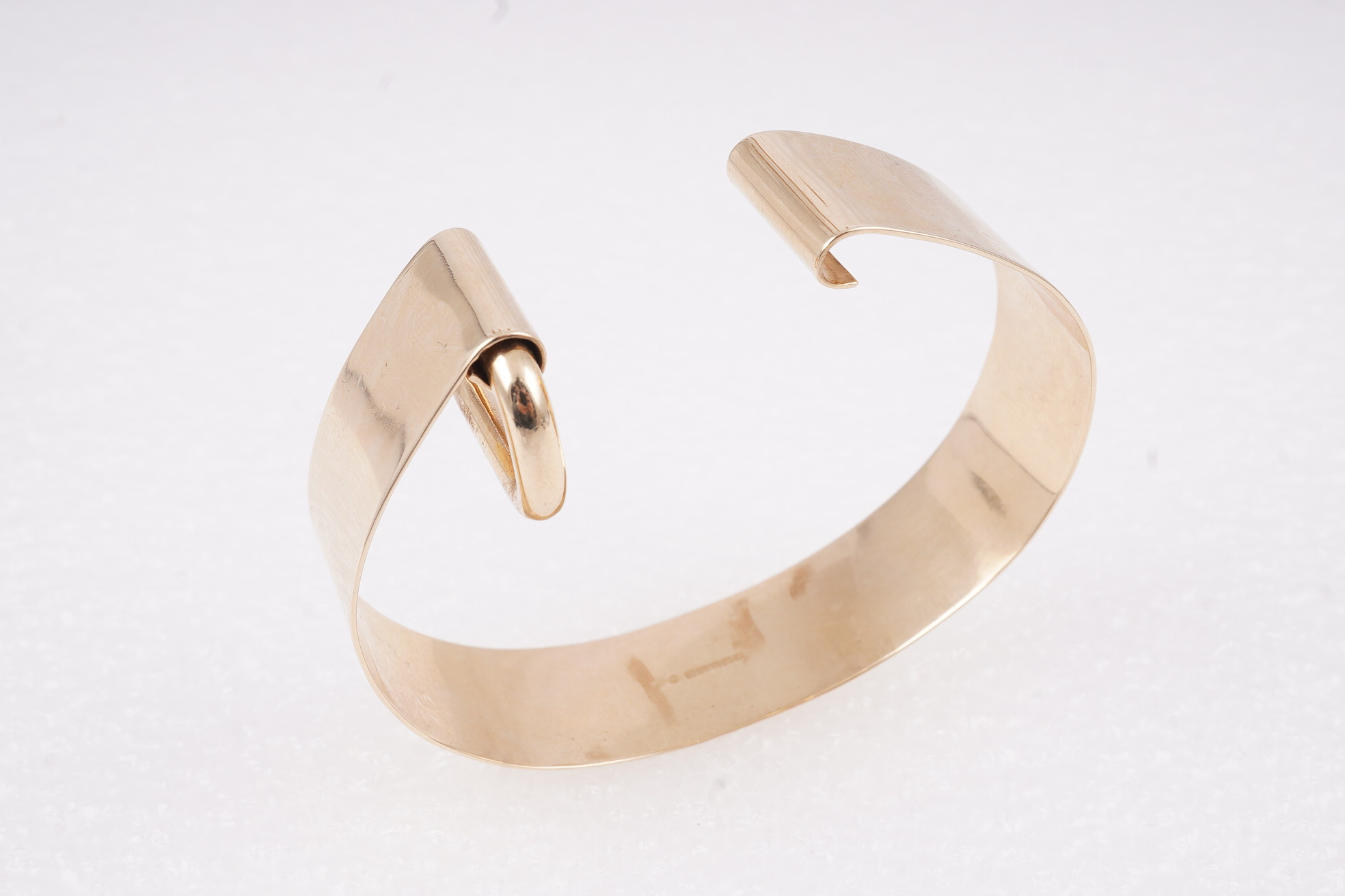 A stylish gold bangle, circa 1972, the plain 9ct gold band centring on a buckle clasp, inner circumference approximately 17cm, widest point 2.6cm, British hallmarks, sponsor's mark JF, gross weight approximately 31 grams