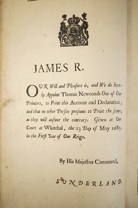 ° [Sprat, Thomas] A True Account and Declaration of the Horrid Conspiracy against the Late King, His Present Majesty and the Government: as it was ordered to be published by His Late Majesty. licence leaf before title, headpiece decoration; (4), 167pp.; old calf, panelled spine with red label, folio. In the Savoy: printed to be sold by Thomas Newcomb ... and to be sold by Sam. Lowndes ... 1685; bound with (as issued). Copies of the Informations and Original Papers relating to the Proof of the Horrid Conspiracy ... headpiece decoration. In the Savoy: printed by Thomas Newcomb ... 1685. *the Rye House Plot (1683) and the Monmouth Rebellion; Zeale, John - A Narrative of the Phanatical Plot, setting forth the Treasonable and Wicked Designs which they have been carrying on against the King and Government ... To which is added, a relation of the evil practices of John Rowse (who was lately executed at Tyburn) William Lewis (who stands convicted) and others. decorated initial letters; (8), 36pp. sometime rebound half calf and marbled boards, gilt top (distressed), folio. Printed for the Author, and to be sold by most Booksellers in Westminster and London, 1683. *an evidential controversy regarding the Earl of Shaftesbury and the Rye House Plot (2)