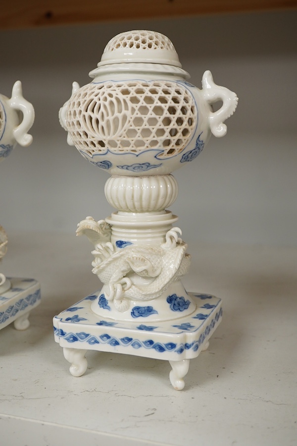A pair of Japanese Hirado blue and white reticulated urns and covers decorated in relief with dragons, 20cm high