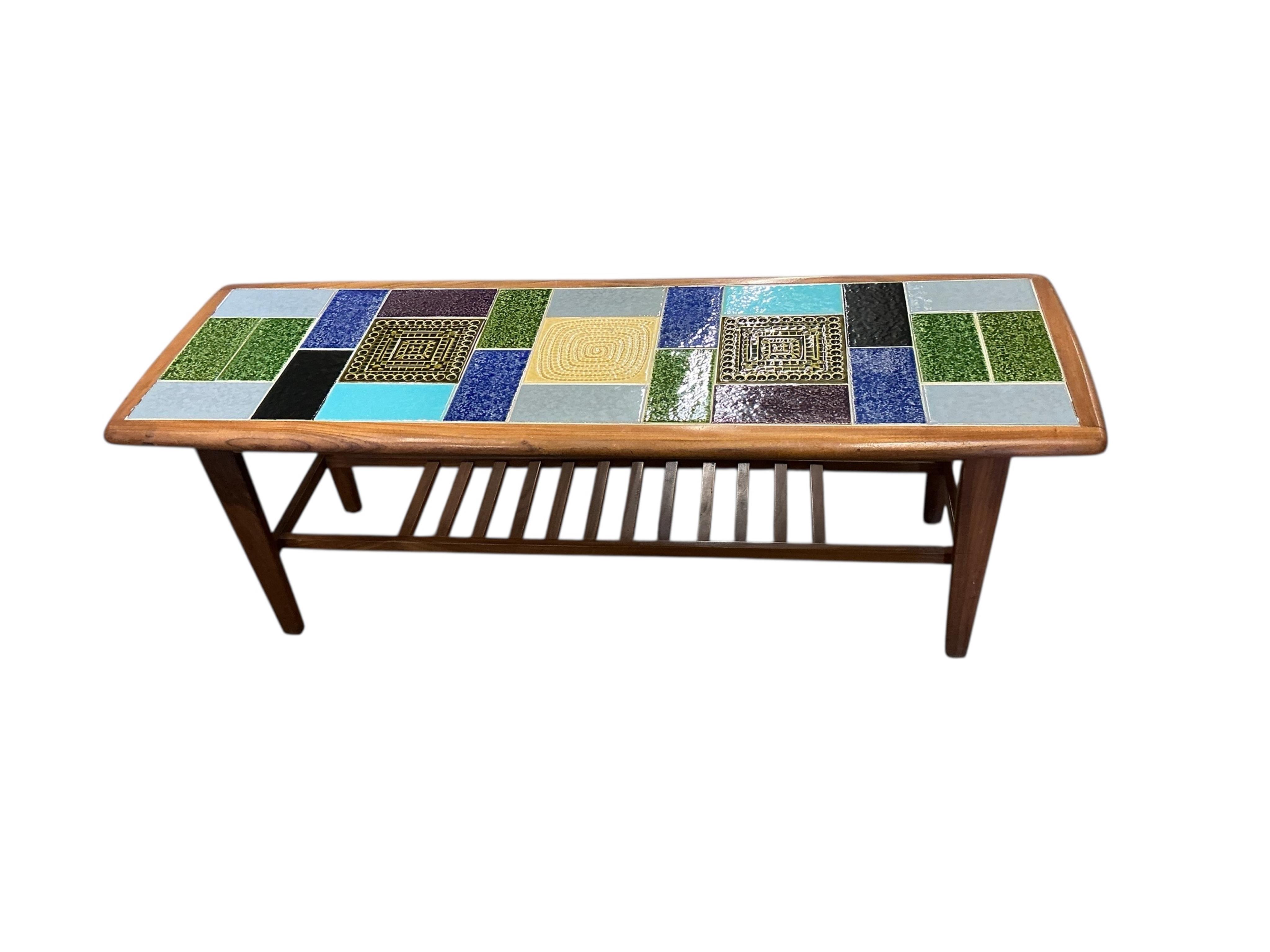 A tile top coffee table designed by Kenneth Clark,1965, for Heals, width 115cm, depth 38cm, height 39cm