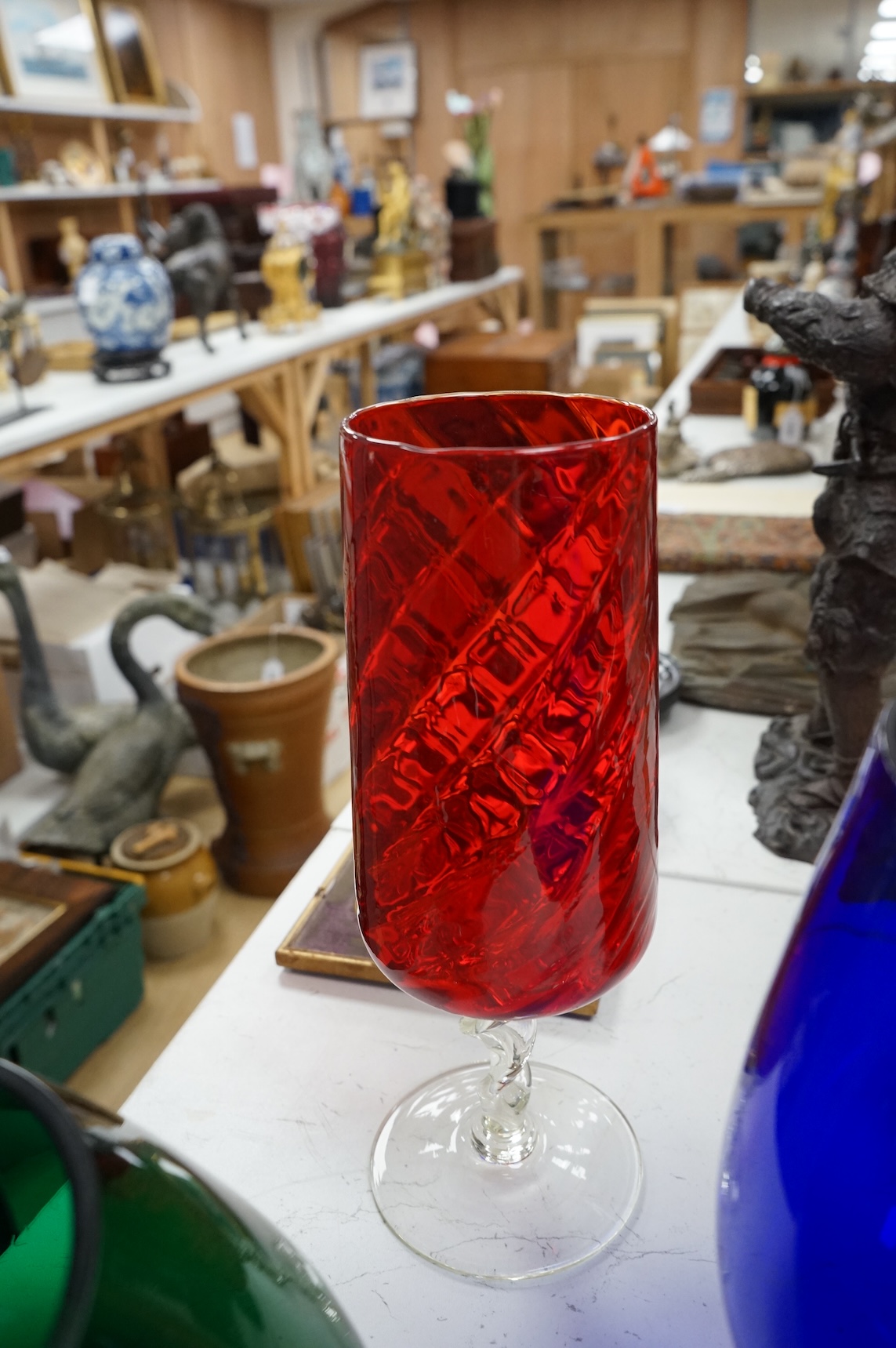 Lot 1177 , Four pieces of mid-century coloured glassware, to include a jug and an oversized brandy balloon, largest 48cm high