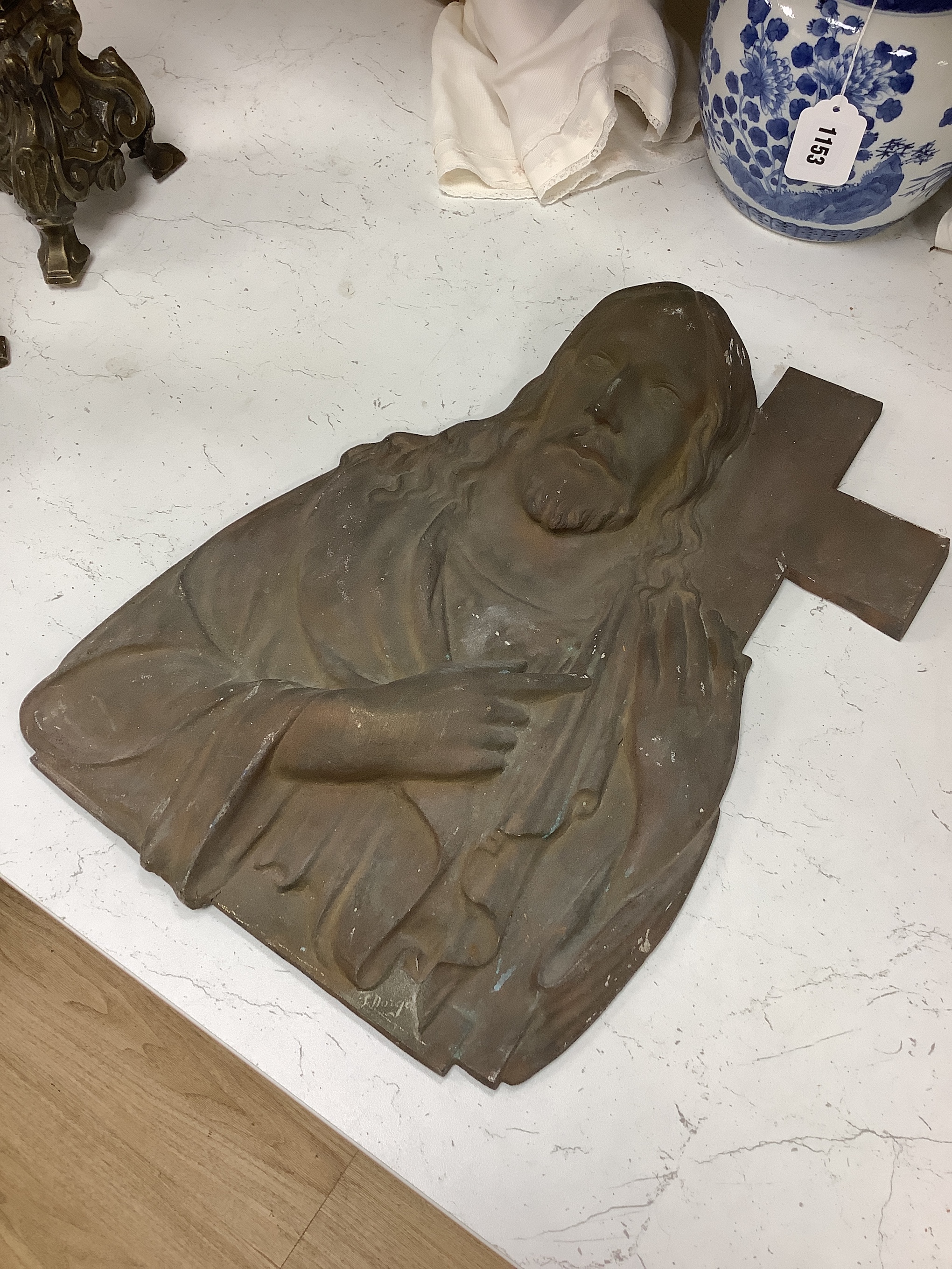 Lot 1169 , After Sylvian Norga, a cast bronze plaque, Christ with cross, signed, 45cm high